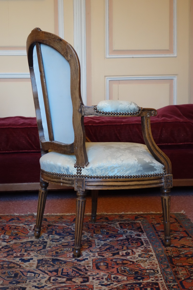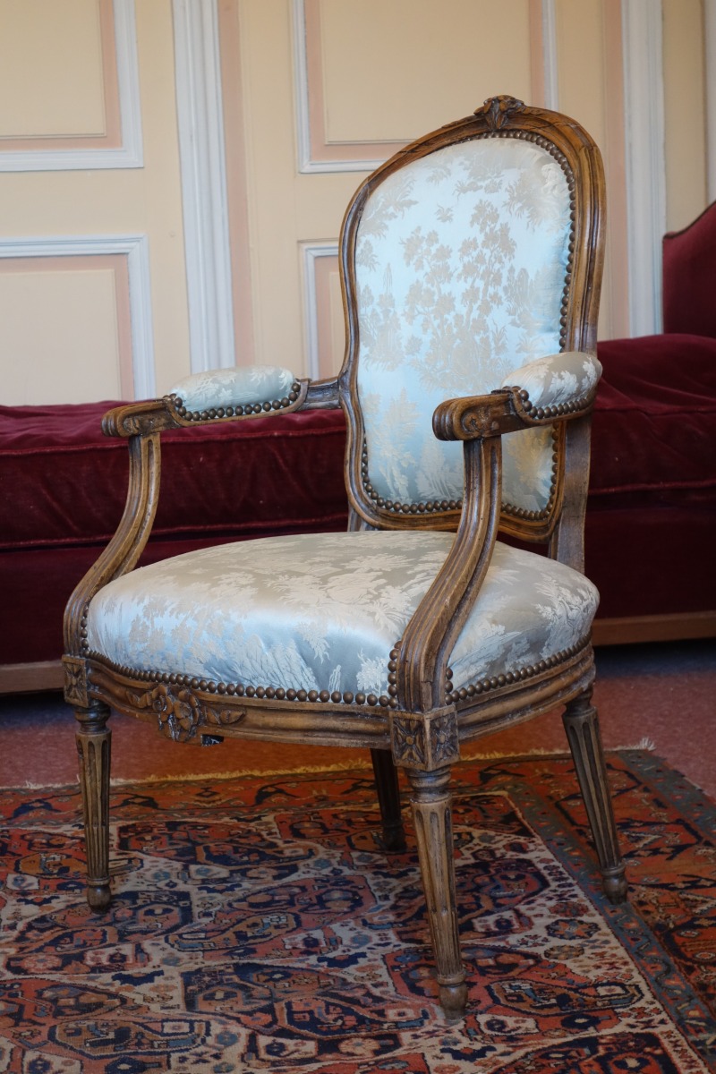 JOINT: FAUTEUIL CABRIOLET en bois mouluré et sculpté. Dossier orné de fleurs à l'amortissement. Accotoirs à manchette, consoles d'accotoir galbées et dés de raccordement ornés d'une rosace. Ceinture centrée d'un motif floral. Pieds à section ronde fuselés cannelés, les antérieurs rudentés.