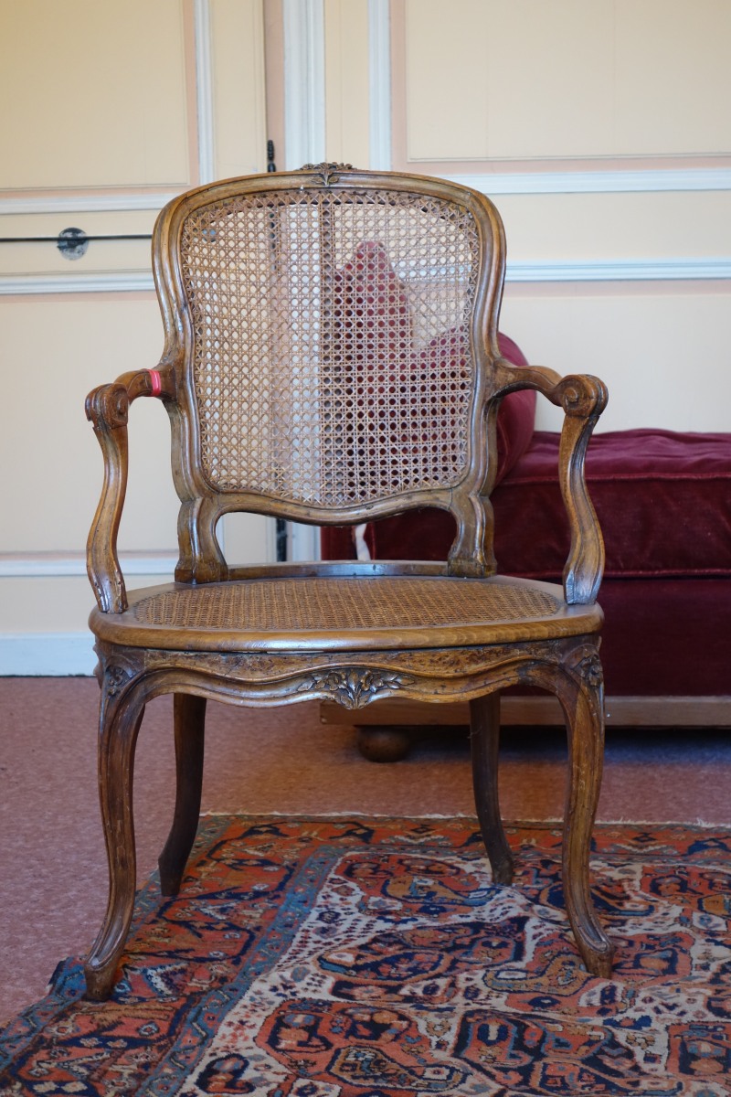 FAUTEUIL CABRIOLET canné en bois mouluré et sculpté. Dossier orné de fleurs à l'amortissement. Accotoirs et consoles d'accotoir mouvementés, la ceinture est centrée d'un motif floral. Il repose sur quatre pieds galbés agrémentés de fleurs.