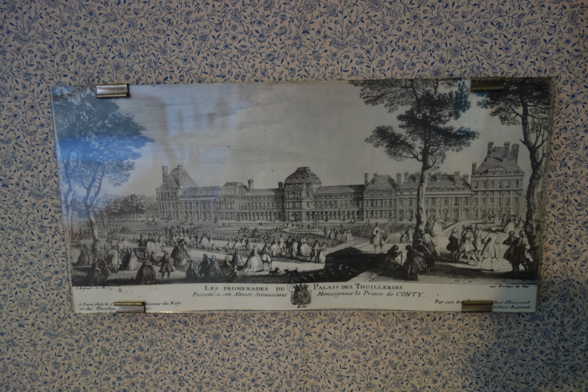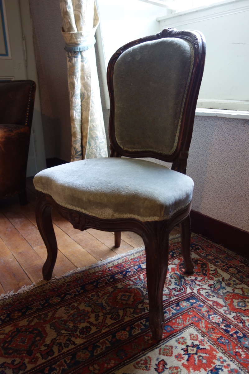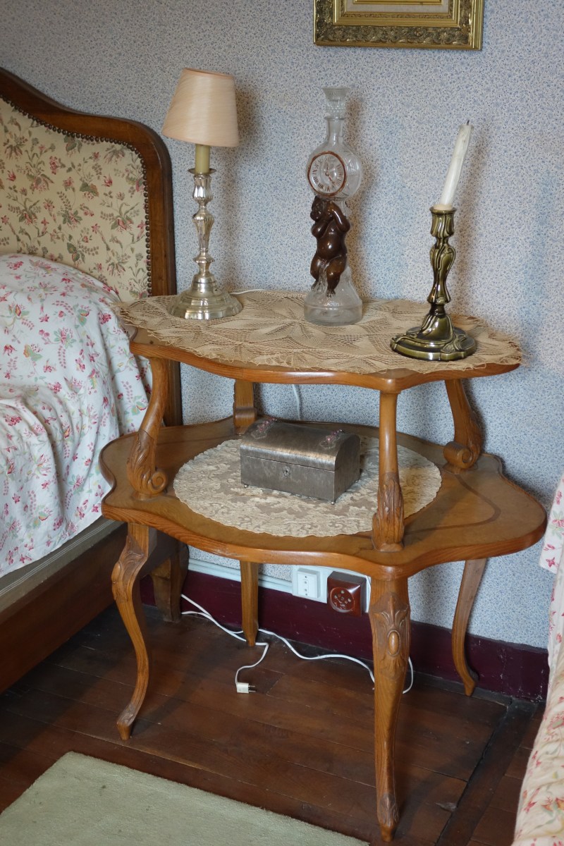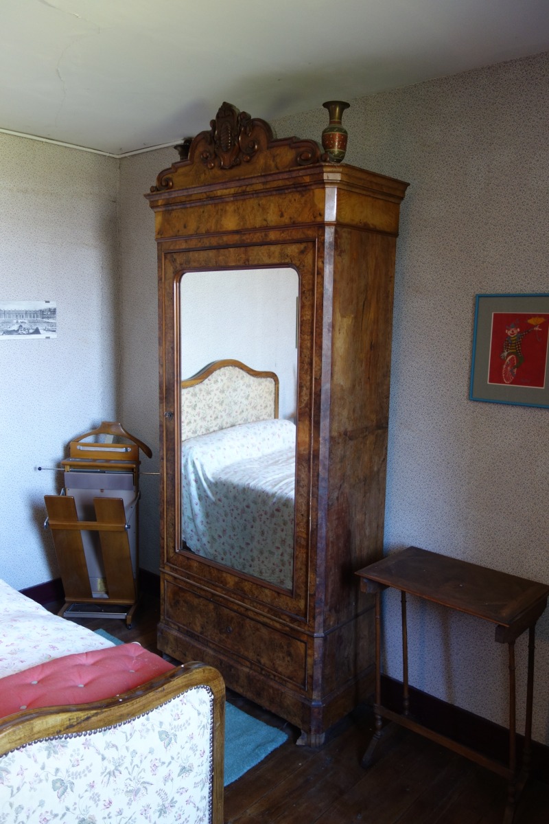 CONTENU DE LA PREMIÉRE CHAMBRE comprenant notamment DEUX LITS en bois naturel, une TABLE À THÉ à double plateau en bois naturel sculpté et placage de bois ronceux, une ARMOIRE en placage de loupe à fronton sculpté ouvrant par une porte à fond de glace (milieu du XIXe), une BERGÈRE du XIXe, une CHAISE de style XV ancien, une TABLE À ÉCRIRE, un valet de nuit, divers bibelots et pièces encadrées.