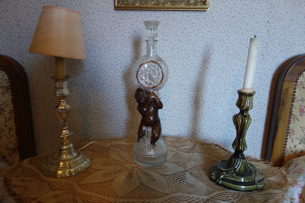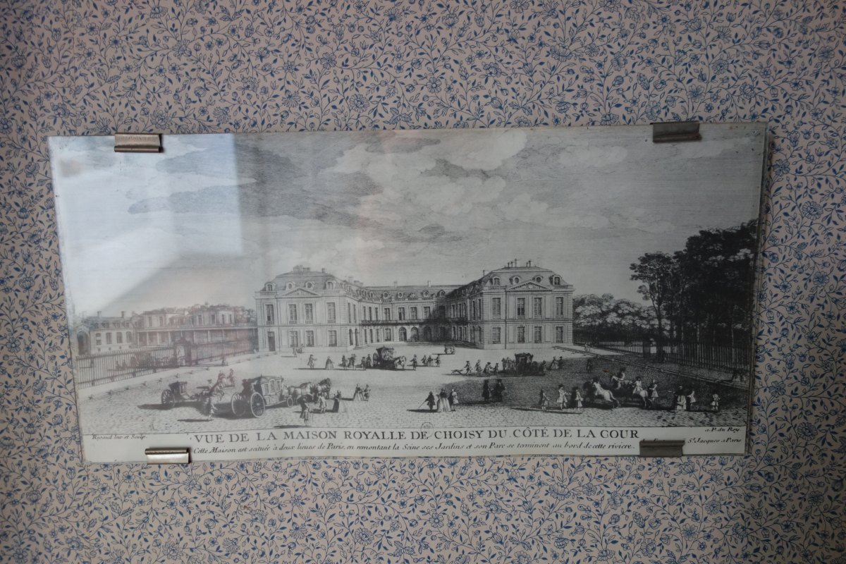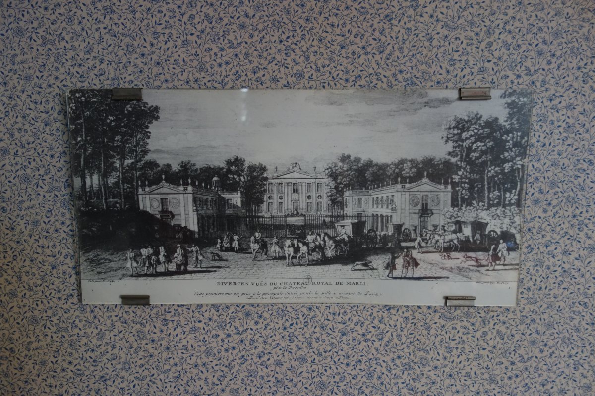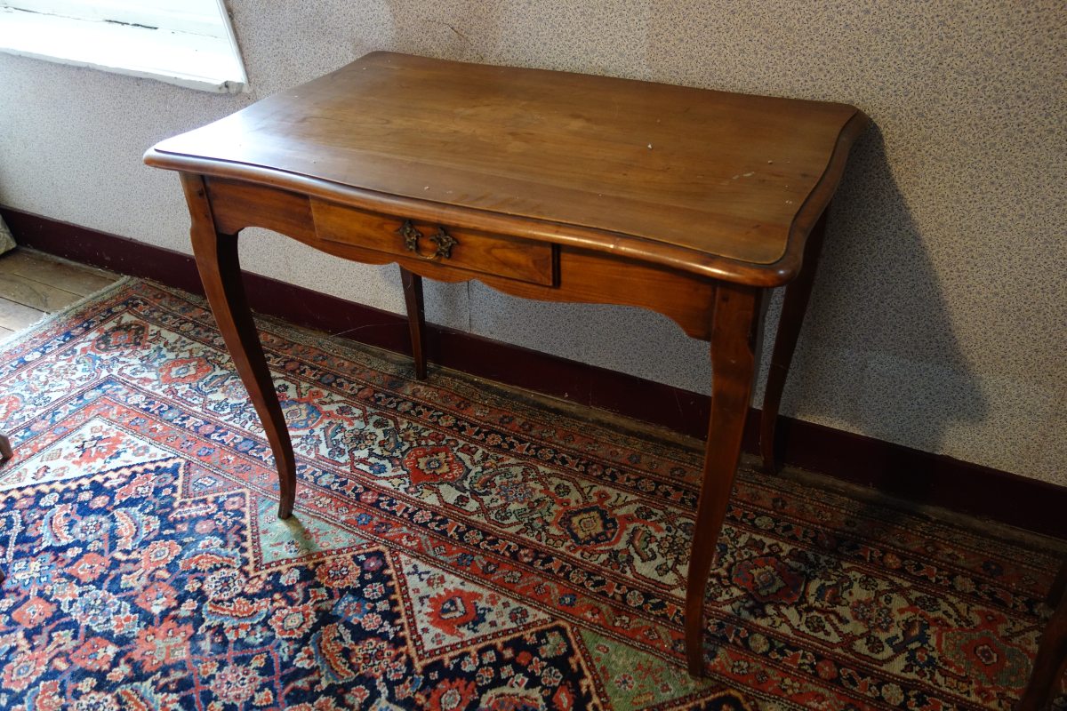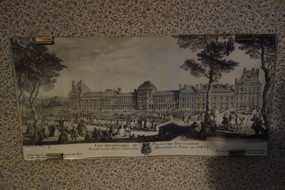 CONTENU DE LA PREMIÉRE CHAMBRE comprenant notamment DEUX LITS en bois naturel, une TABLE À THÉ à double plateau en bois naturel sculpté et placage de bois ronceux, une ARMOIRE en placage de loupe à fronton sculpté ouvrant par une porte à fond de glace (milieu du XIXe), une BERGÈRE du XIXe, une CHAISE de style XV ancien, une TABLE À ÉCRIRE, un valet de nuit, divers bibelots et pièces encadrées.