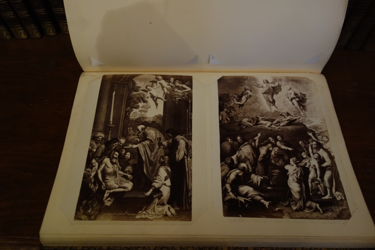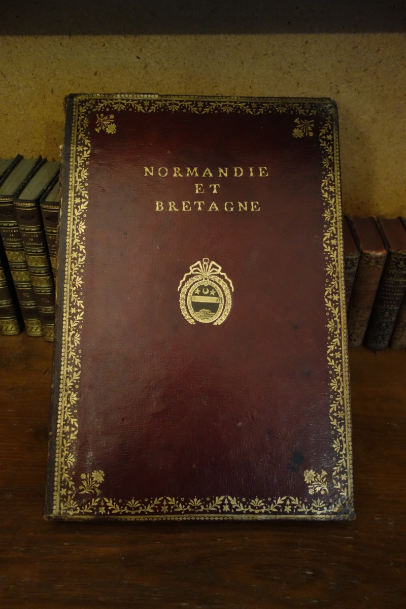 Maroquin rouge in-folio, portant en supra-libros (lui aussi XVIIIème) "Normandie et Bretagne" ; en son centre des armoiries XIXème. Le corps d'ouvrage a été remplacé par quelques photographies industrielles italiennes de la fin XIXème. (Un mors fendu).