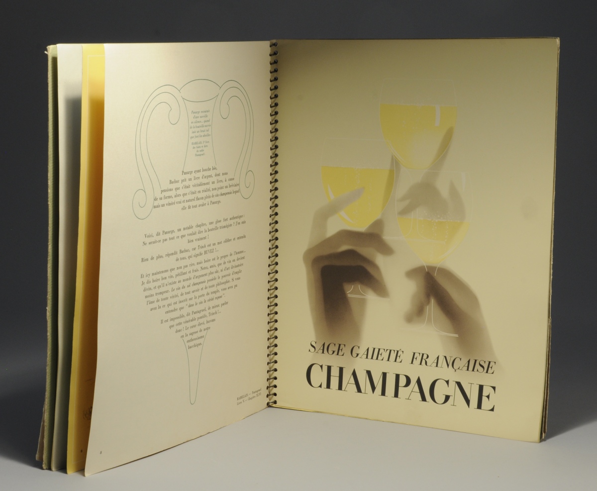 Album à la mémoire de Dom Pérignon, et à l'occasion du 250ème anniversaire de la découverte de la mousse de Champagne. Cet album édité par les 35 maisons champenoises qui, dans l'union, perpétuent son oeuvre. Dessin Paul Iribe, texte Pierre Lestringuez, imprimerie Draeger, 1932. Reliure spirale.