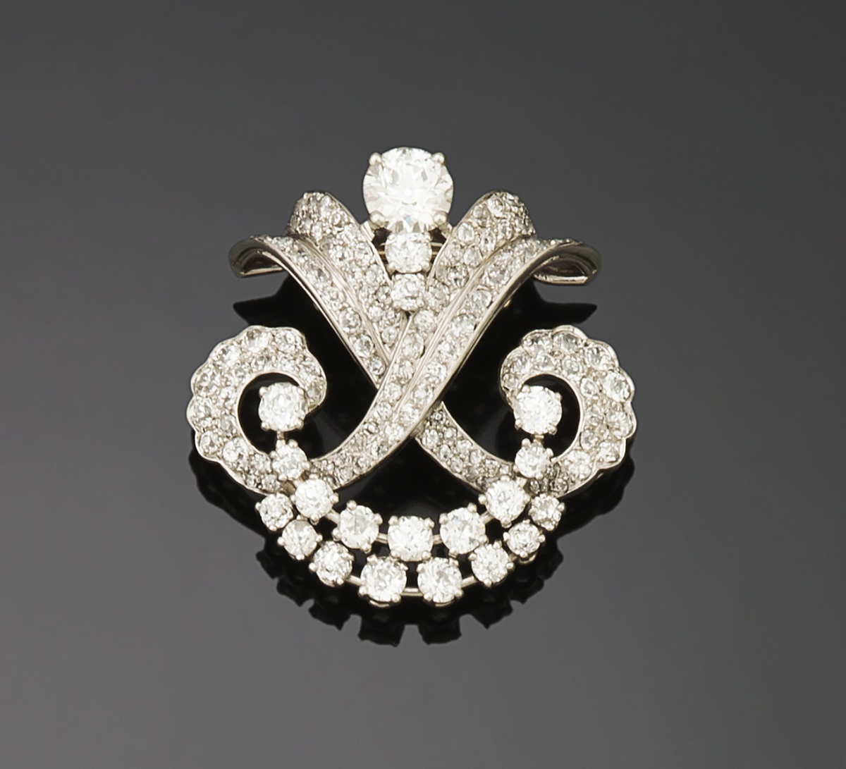CLIP de revers en platine 850 millièmes et or gris 750 millièmes ajouré, à décor de deux volutes entrecroisées et deux lignes, entièrement serti de DIAMANTS ronds de taille ancienne, un plus important demi-taille d'environ 1 à 1,2 carats.