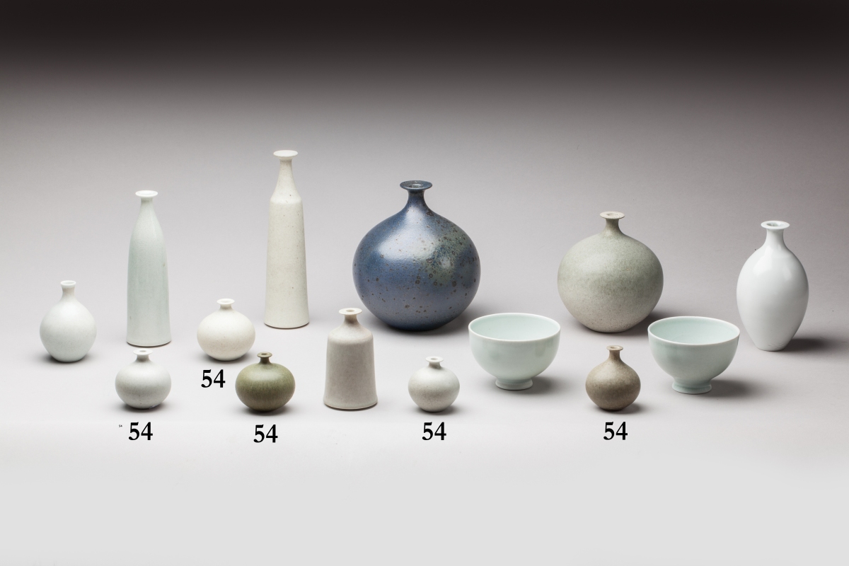 Robert DEBLANDER. Five small round white and green sandstone VASES. Signed.
