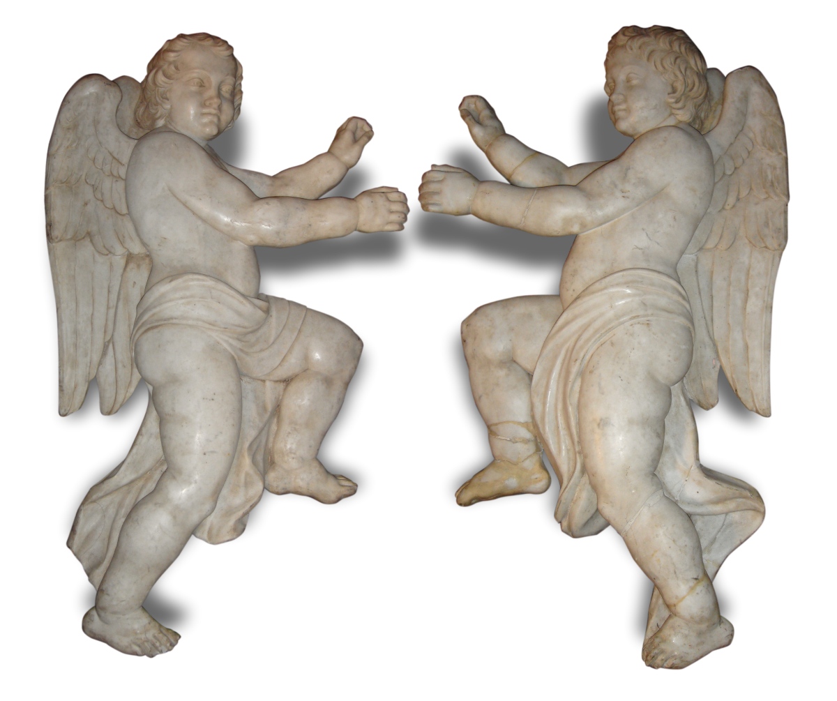 Notre paire d'anges proviendrait, d'après la tradition familiale, d'une demeure de la famille Borghese. Celle-ci lance au XVIIe siècle de grands chantiers de construction, de restauration et de rénovation. C'est le cas notamment de la Villa Borghese à Rome construite en 1607 et rénovée en 1770, du Palais Borghese sur le Quirinal construit en 1560 et rénové en 1614, de la Villa Mandragone rénovée par les Borghese en 1616-1618, mais aussi des monuments pour l'église Santa Maria Maggiore en 1622. À l'occasion de ces constructions et rénovations, la famille fait appel à de grands artistes comme Le Bernin, qui a probablement inspiré cette composition dont nous n'avons pu retrouver avec précision l'origine.