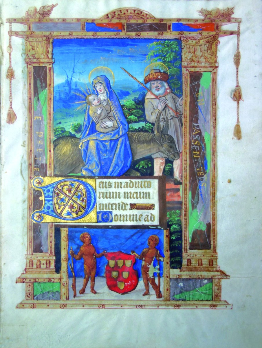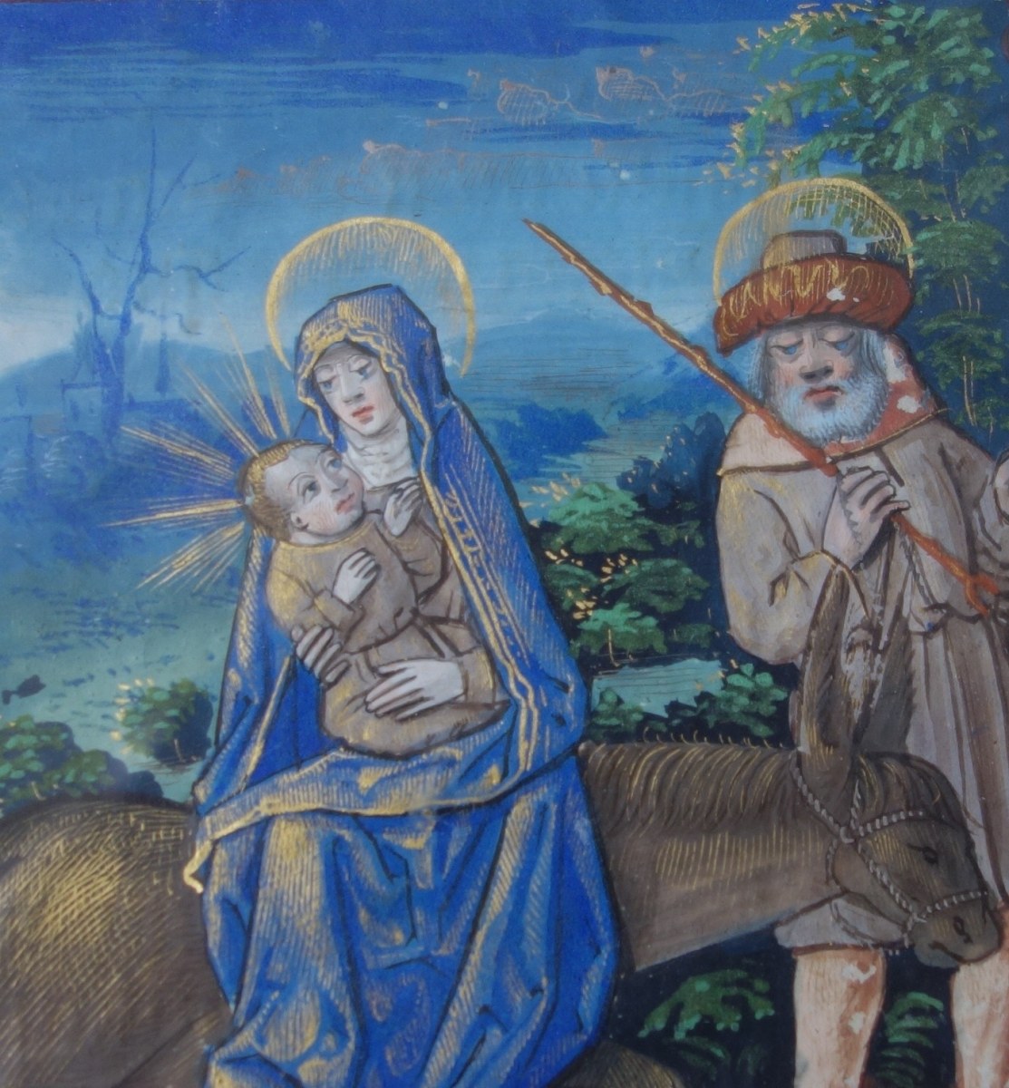Cette miniature, de belles dimensions, illustre le début de Vêpres. Elle représente dans sa partie supérieure, Marie et l'enfant Jésus conduits par Joseph lors de la fuite en Égypte ; en arrière-plan sur fond bleuté, une rivière et des collines arborées ouvrent une intéressante et peu habituelle perspective.