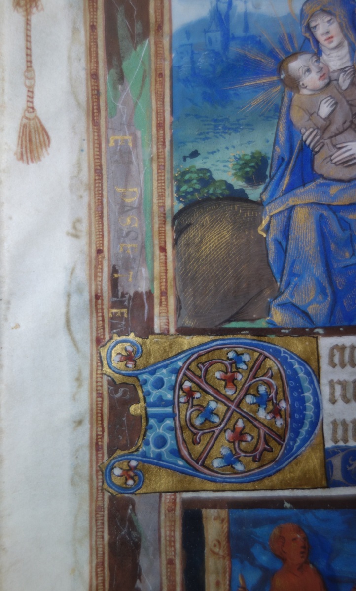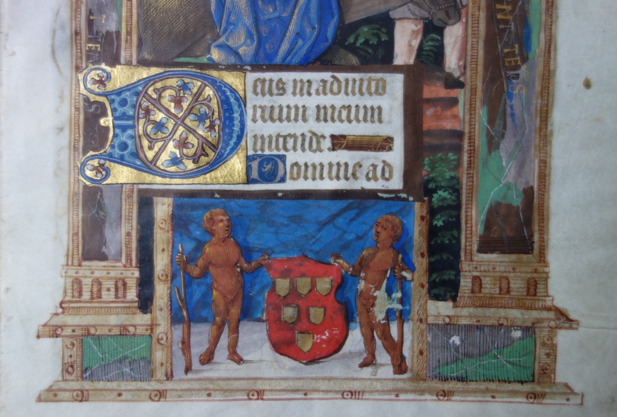 Cette luxueuse miniature sur vélin est aux armes de la famille Monthefelon, originaire d'Anjou. Un précieux livre d'heures illustré par le Maître de Luçon (vers 1425), portant le nom et les armes de Anne de Monthefelon est conservé dans le fonds ancien de la ville de Bourges.