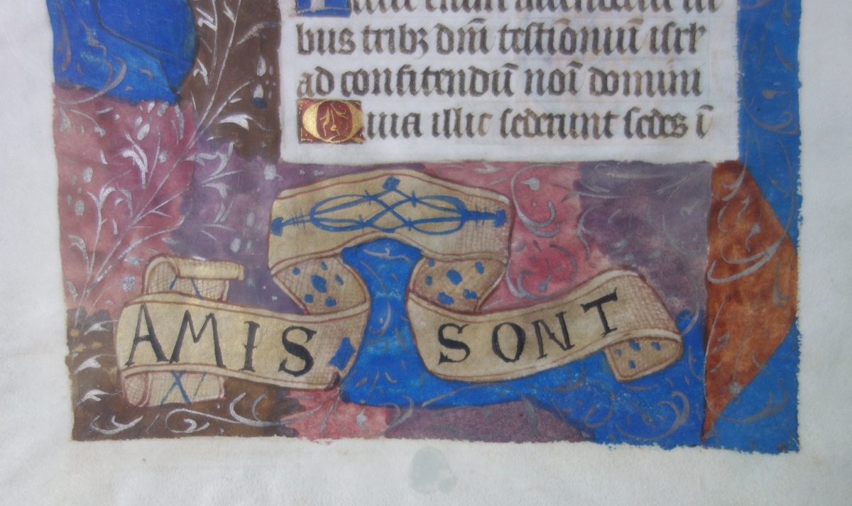 Au verso sur un très riche encadrement travaillé à l'or et aux gouaches rouge et bleu, figure une autre devise liée par un lac d'amour " Amis sont "