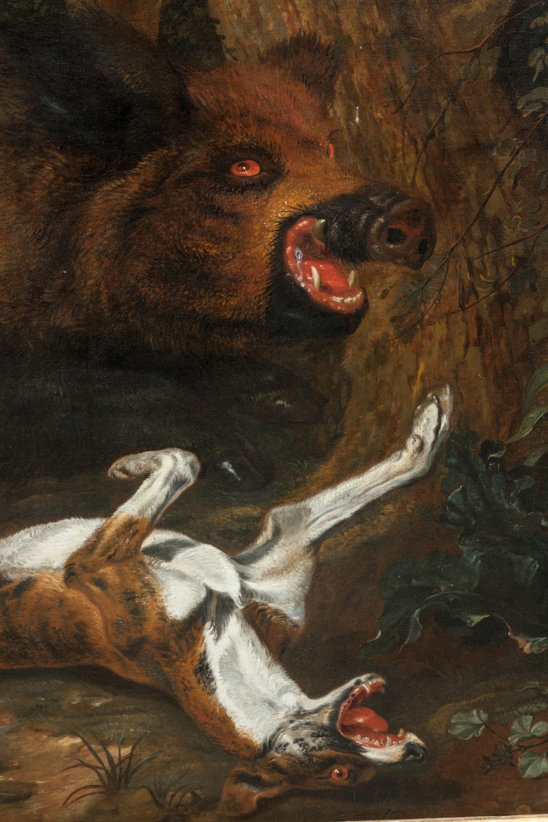 Reçu maître à la Guilde de Saint-Luc d'Anvers en 1620, Paul de Vos obtient des commandes de tableaux de chasses et de batailles d'animaux, dans des dimensions monumentales, de la part de l'Empereur du Saint-Empire romain germanique, du roi d'Espagne, du duc d'Aershot. Comme son beau-frère Snyders, il collabore avec Rubens, et en retient la fougue et le mouvement baroque, la tension frénétique de l'action, comment rendre dynamique ses compositions. Ici, le sanglier est assailli par la meute et se débat, la violence de l'action contrastant avec le calme paysage vallonné où elle a lieu. Suivant son habitude stylistique personnelle, le peintre a opposé les valeurs foncées de la bête aux tons clairs de chiens.