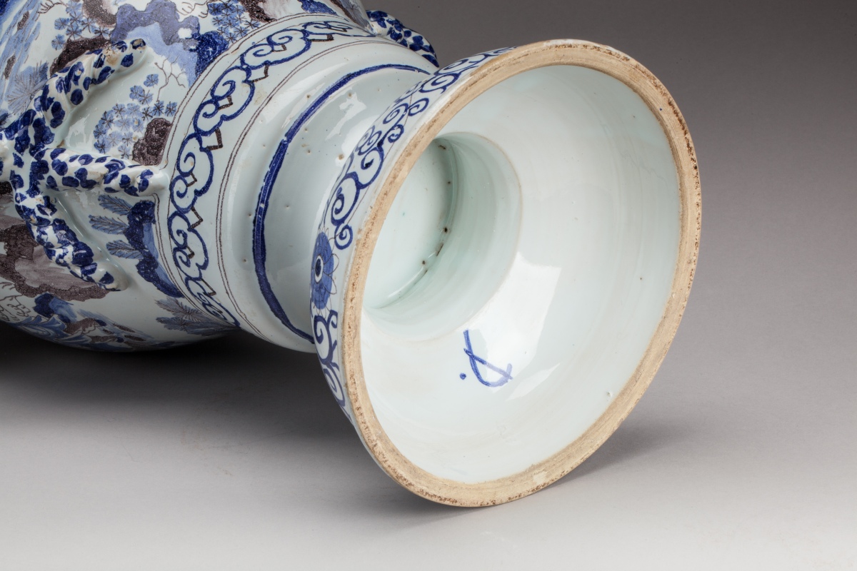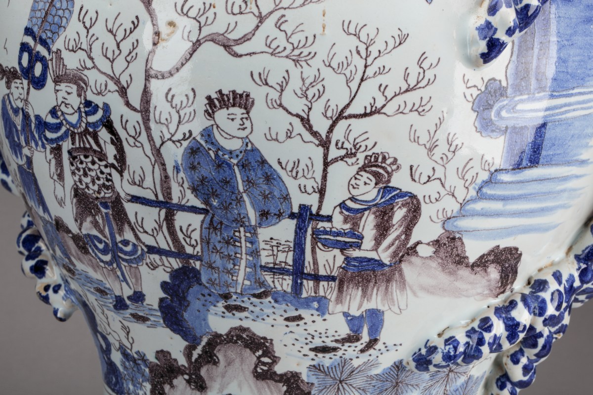 NEVERS. Vase balustre couvert en faïence émaillée bleue et manganèse sur fond blanc. Décor sinisant de scènes d'offrandes dans un paysage fantaisiste. Le piédouche est orné d'une frise de ferronneries et soleils. Deux importantes anses torsadées adoptent un motif bleu dit "à la bougie". Le couvercle représentant un chinois se reposant sur un massif rocheux est surmonté d'une prise en toupie émaillée bleue. Marque "D" ou "A" en bleu.