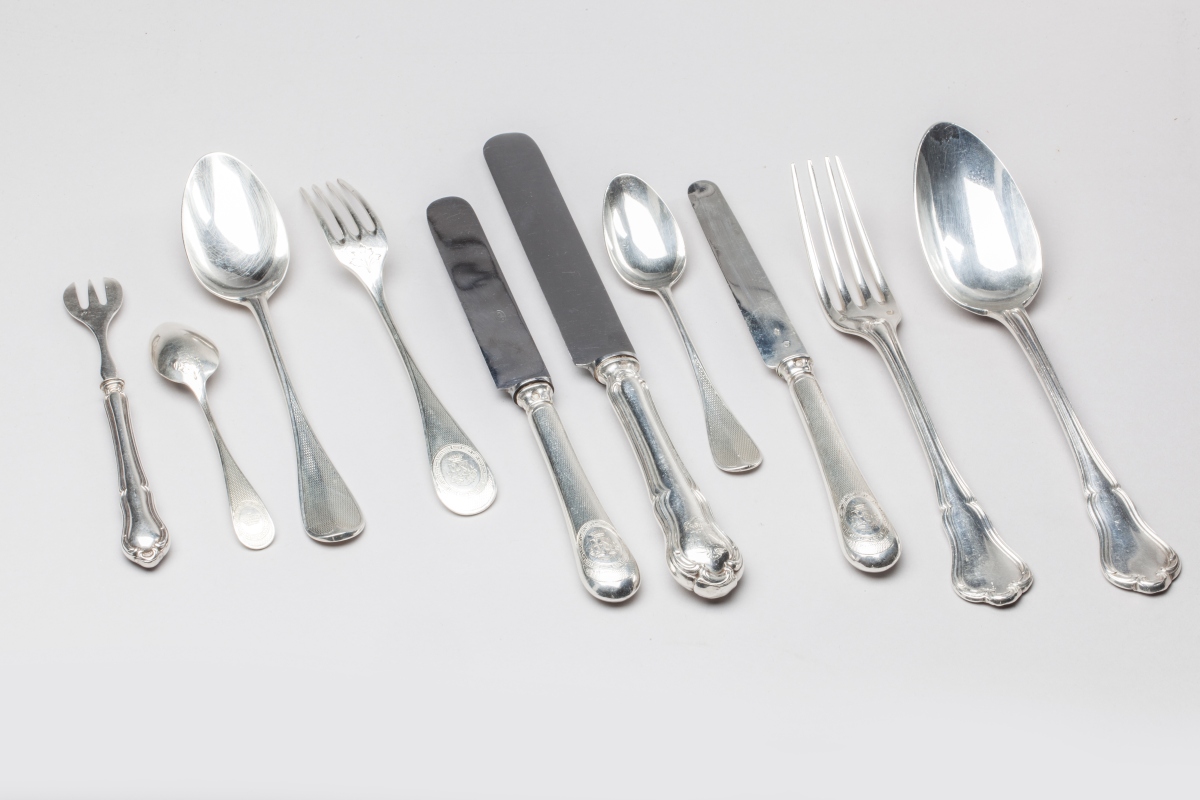 Importante MÉNAGÈRE en argent de 205 pièces, modèle filets-contours à volutes feuillagées ou croisillons, gravées d'armes d'alliance timbrées d'une couronne comtale.