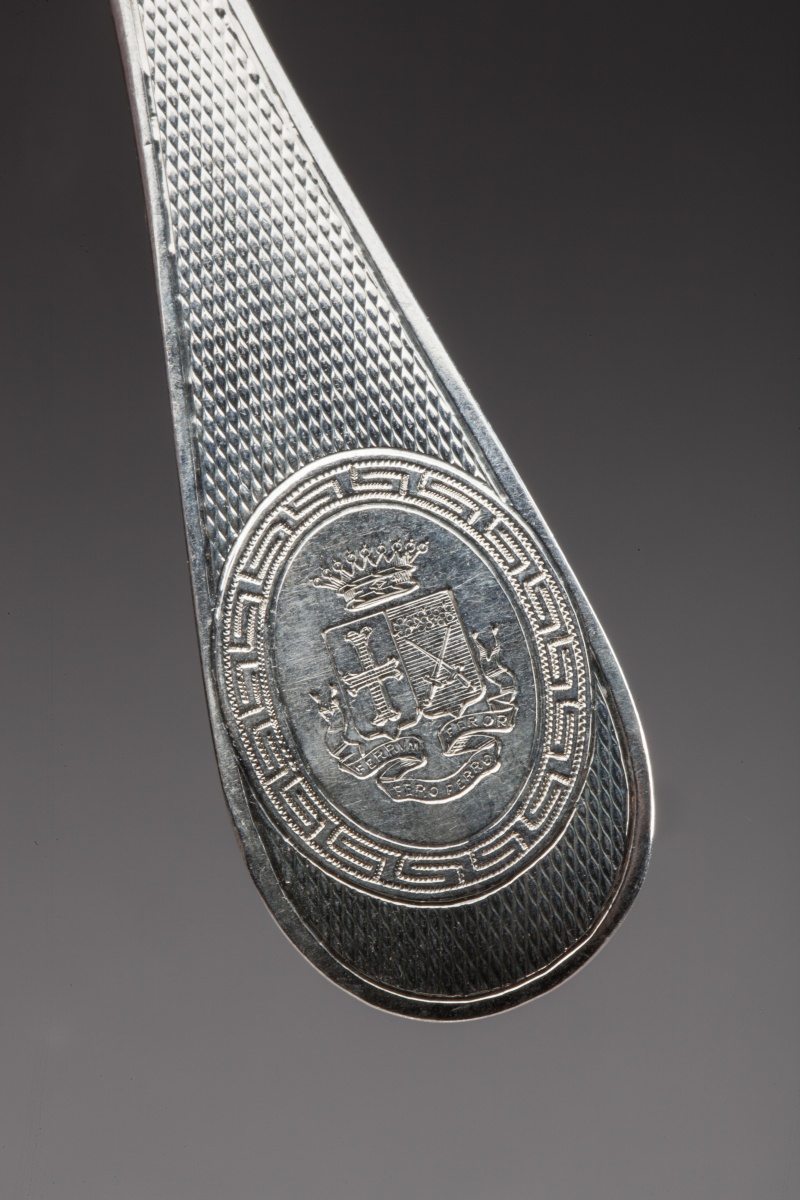 Provenance: les armes d'alliances sont celles des familles de Montalembert (d'argent à la croix ancrée de sable) et Guesdon de Beauchesne (d'azur, à deux épées d'argent, les pointes en haut, mises en sautoir, surmontées de trois roses d'or mises en chef). Cette ménagère fût probablement offerte en présent suite au mariage de Marc-René de Montalembert (1847-1887) avec Marie-Clotilde Guesdon de Beauchesne (1852-1936) célébré en 1875.
