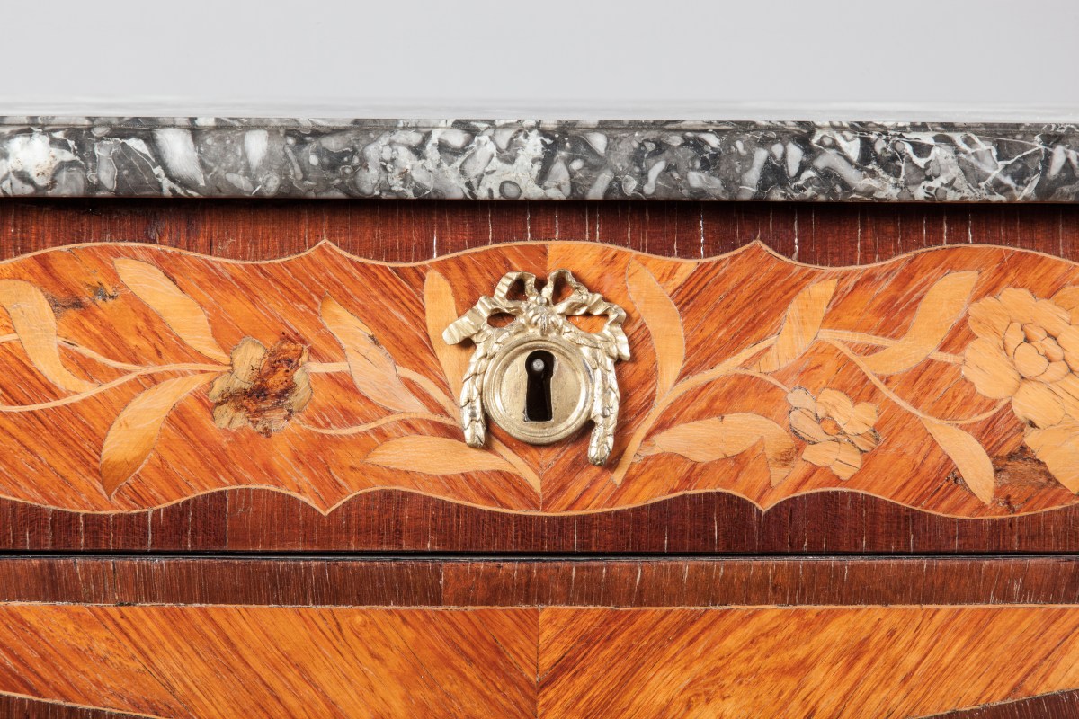 SECRÉTAIRE DROIT en placage de bois de violette, satiné, amarante, bois teintés et incrustations d'ivoire. Il ouvre par un tiroir et un abattant en partie supérieure et deux vantaux en partie inférieure. Au centre de l'abattant figure un personnage masculin drapé incrusté d'ivoire. La façade et les côtés sont ornés de cartouches chantournés accueillant une marqueterie florale. L'abattant foncé de cuir découvre quatre compartiments et six tiroirs sur deux rangs. Leur façade est plaquée de bois de violette et satiné.