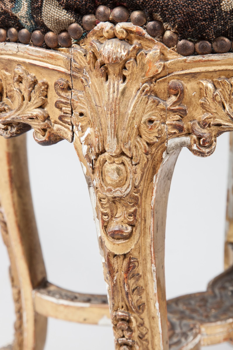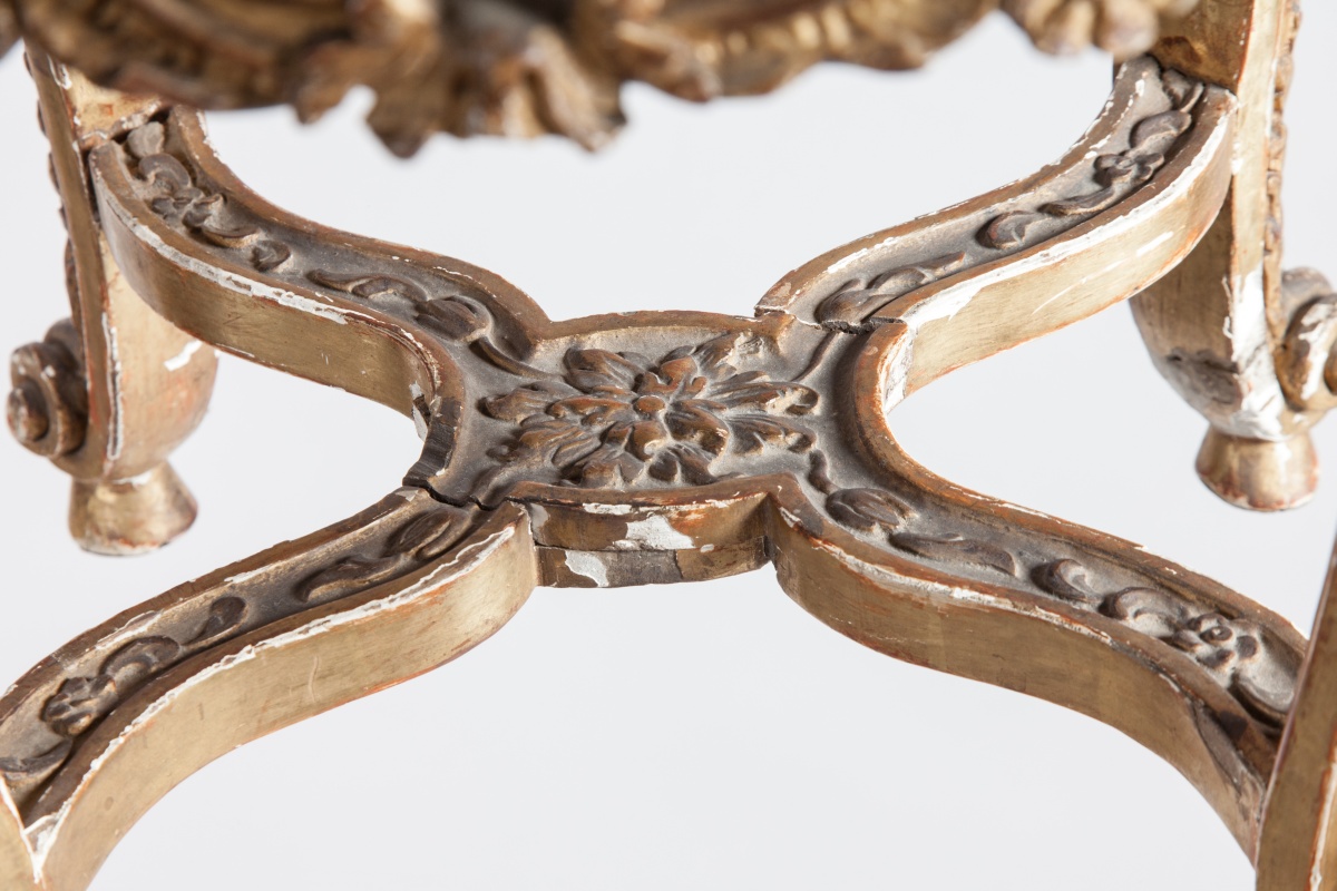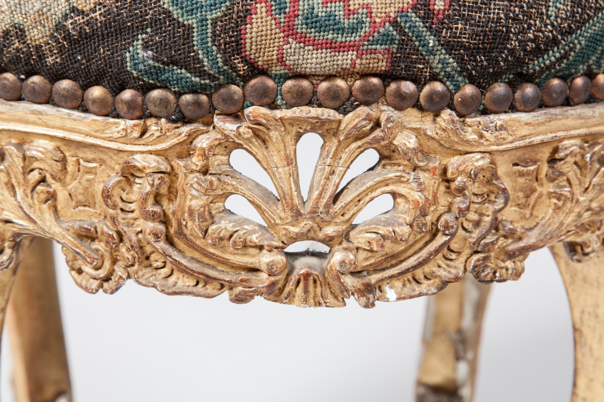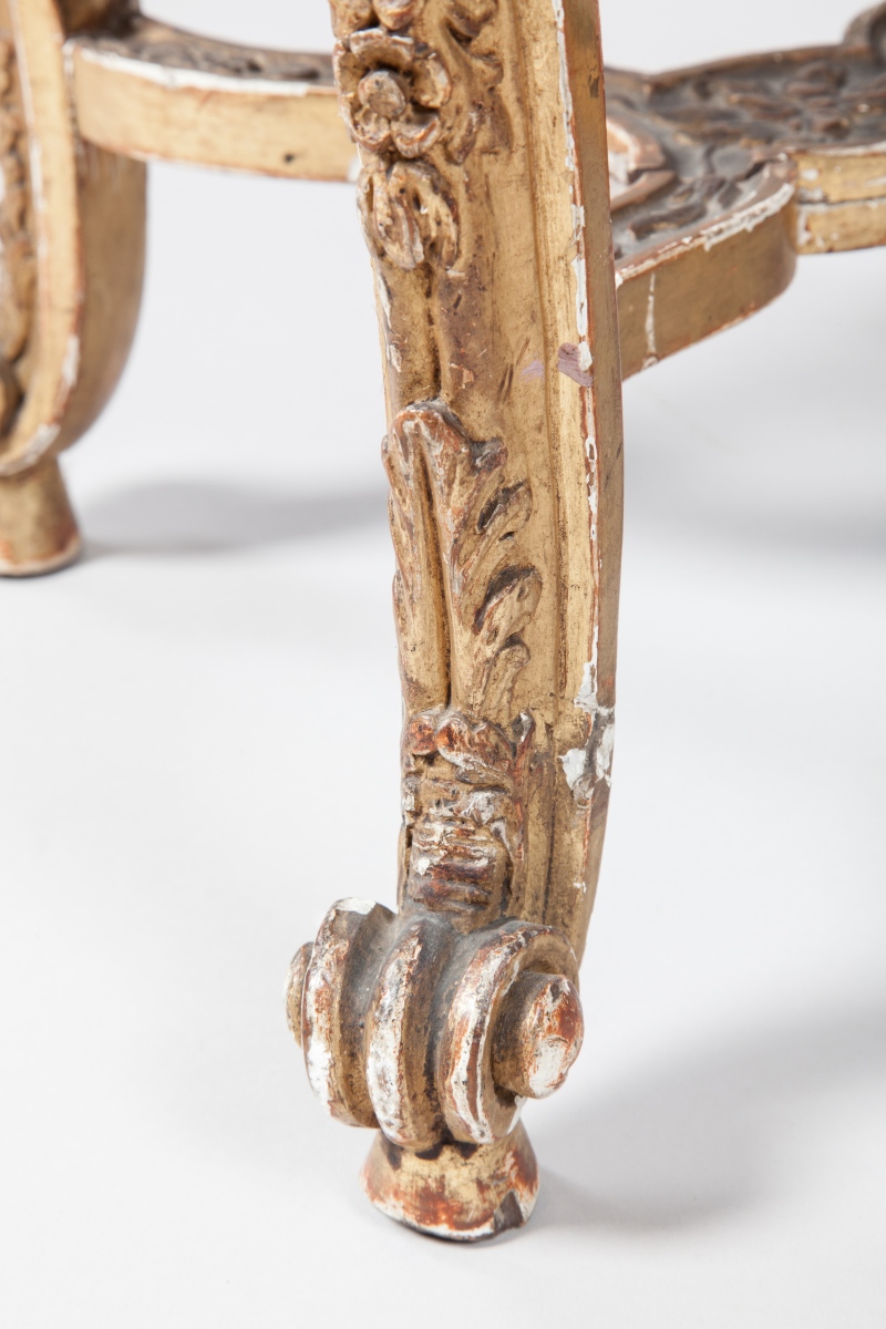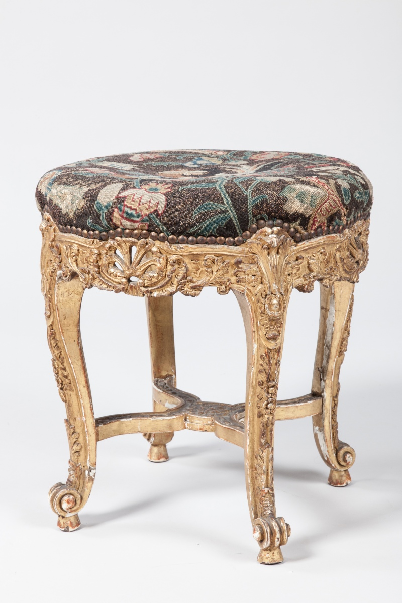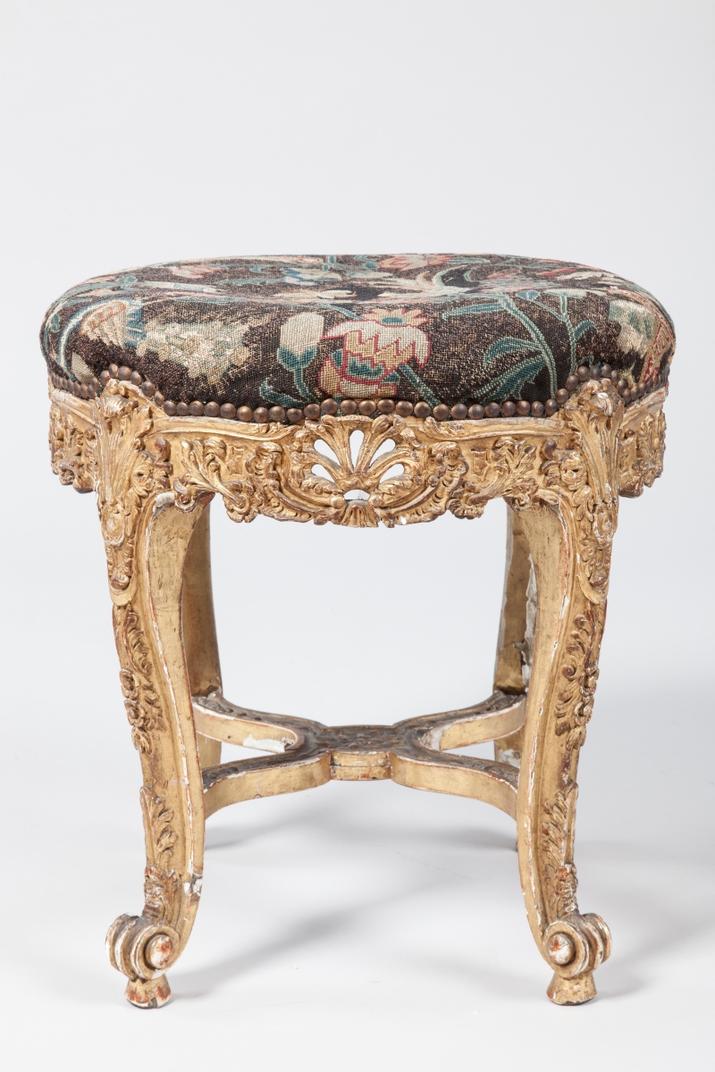 TABOURET en bois mouluré, sculpté et doré reposant sur quatre pieds cambrés reliés par une entretoise en X. Bouts de pieds en escargot. Décor de style rocaille de coquilles ajourées, feuilles d'acanthe et enroulements feuillagés.