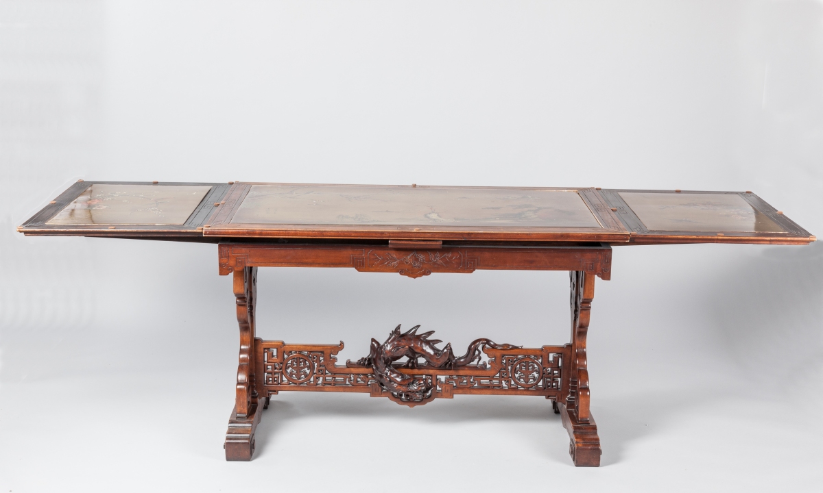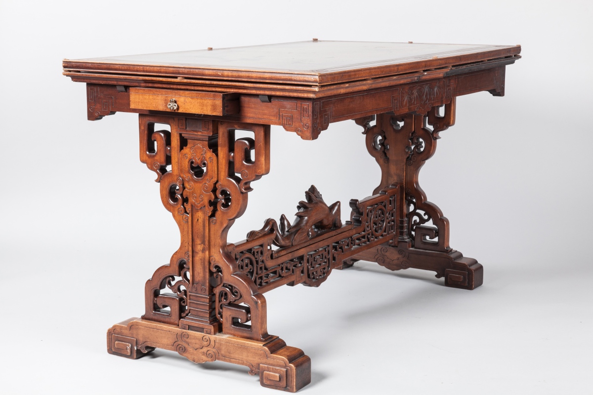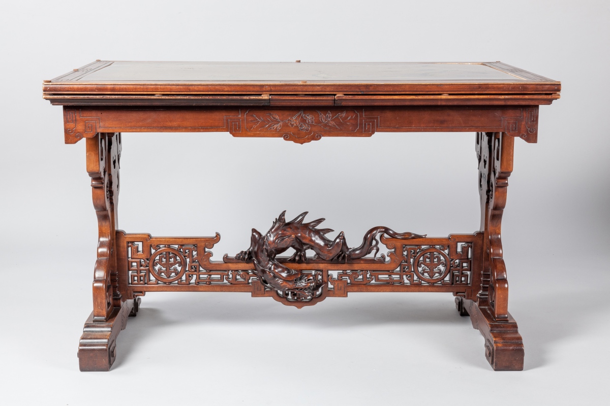 TABLE DE BIBLIOTHÈQUE en bois exotique sculpté et gravé. Le plateau de forme rectangulaire est recouvert d'une peinture japonaise à décor de pagode et d'oiseaux branchés sur un fond doré à la feuille. Il s'ouvre en partie latérale par deux tirettes ornées de façon similaire et deux tiroirs. Ceinture gravée de filets à la grecque et centrée de fleurs et bambous. Deux pieds patins ajourés d'enroulements japonisants sont réunis par une entretoise ornée d'un spectaculaire dragon sculpté en ronde bosse.
