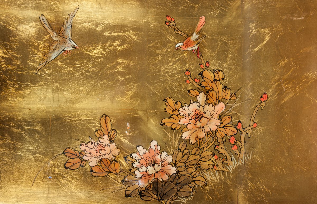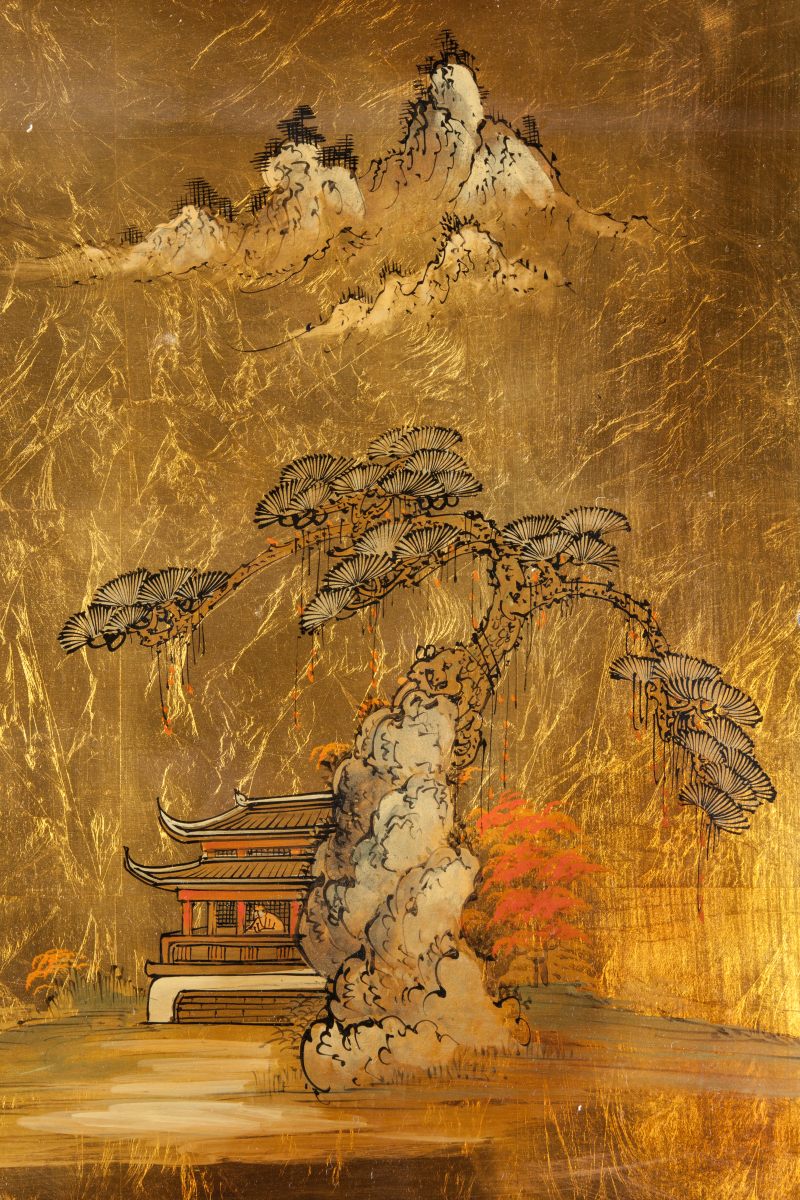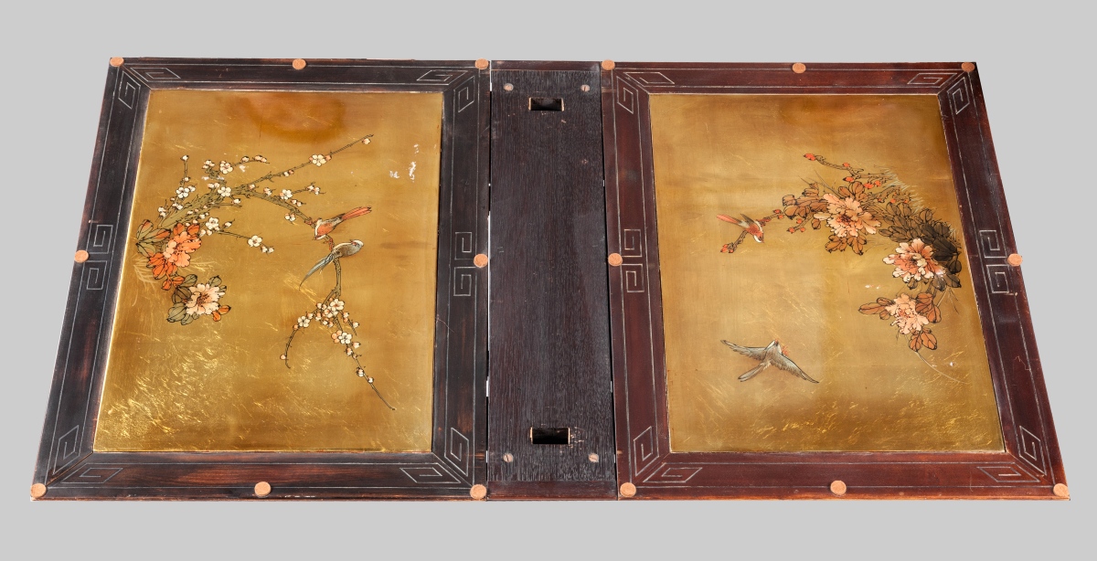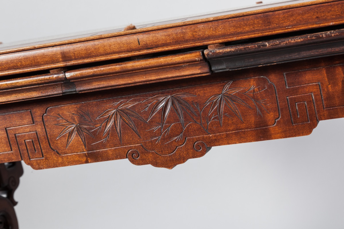 TABLE DE BIBLIOTHÈQUE en bois exotique sculpté et gravé. Le plateau de forme rectangulaire est recouvert d'une peinture japonaise à décor de pagode et d'oiseaux branchés sur un fond doré à la feuille. Il s'ouvre en partie latérale par deux tirettes ornées de façon similaire et deux tiroirs. Ceinture gravée de filets à la grecque et centrée de fleurs et bambous. Deux pieds patins ajourés d'enroulements japonisants sont réunis par une entretoise ornée d'un spectaculaire dragon sculpté en ronde bosse.