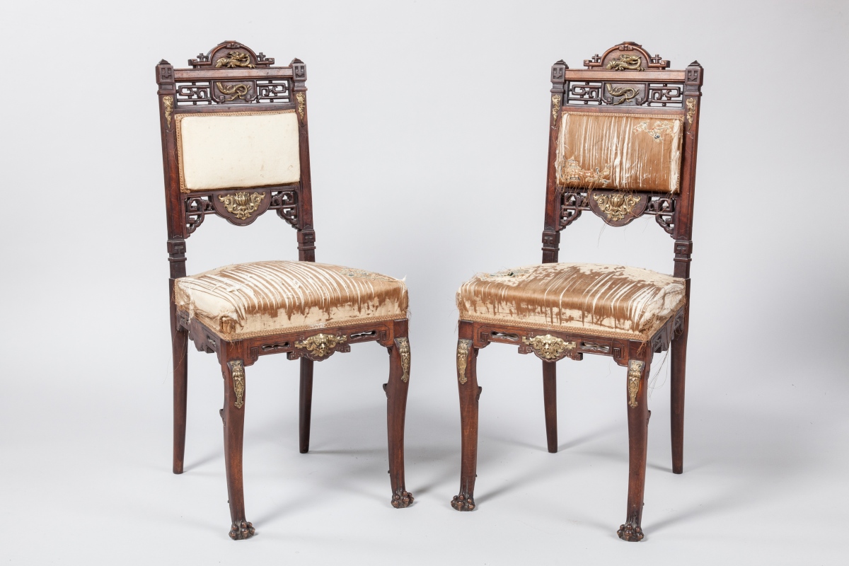Pair of Japanese style gilt-bronze mounted and carved wood CHAIRS signed by Viardot. Late 19th century.