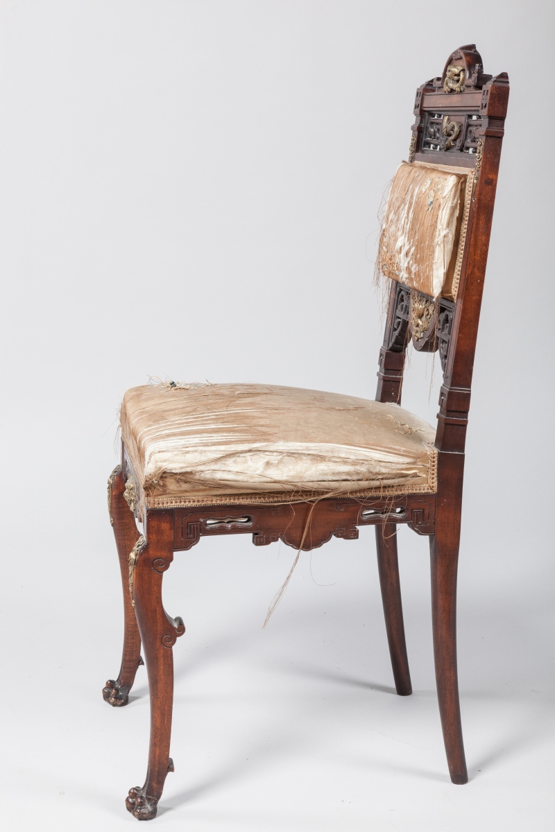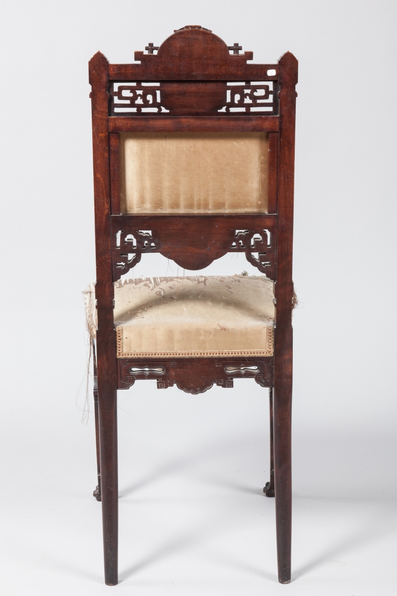 PAIRE DE CHAISES en bois sculpté et ornementation de bronzes ciselés et dorés dans le goût du Japon. Le dossier à décor géométrique ajouré est orné à l'amortissement d'un dragon en bronze doré appuyé avec ses pattes antérieures sur la traverse supérieure du meuble. Un coussin de forme rectangulaire est encadré par deux montants quadrangulaires appliqués de chutes à enroulements en bronze doré. La traverse inférieure également ajourée est centrée d'un cartouche chantourné accueillant un motif floral et feuillagé en bronze doré. La ceinture à décor d'agrafes ajourées et d'encadrement de filets à la grecque est ornée en façade d'une tête monstrueuse. Les pieds antérieurs légèrement cambrés évoquent des pattes de félins par leur délicate sculpture d'enroulements et leur bout de pied en griffe. Ils sont agrémentés en partie supérieure de chutes feuillagées, tandis que les pieds postérieurs sont fuselés à section ronde et légèrement sabre.