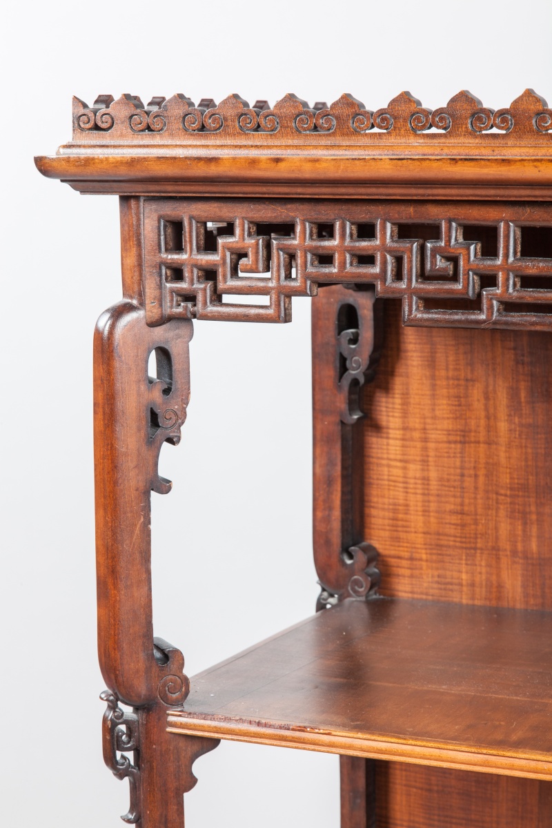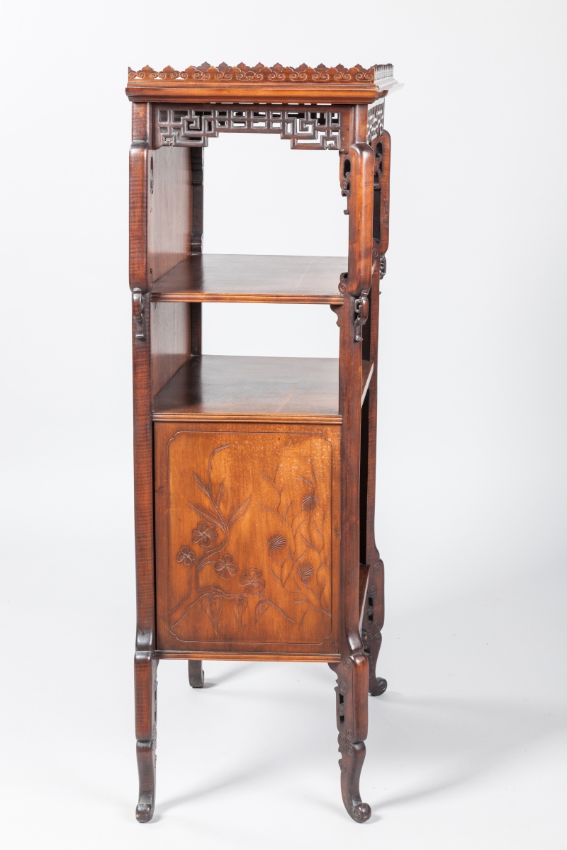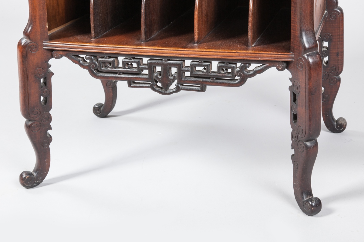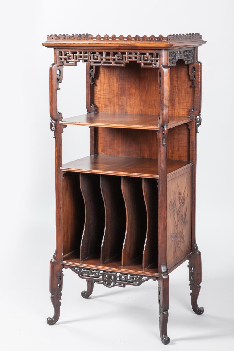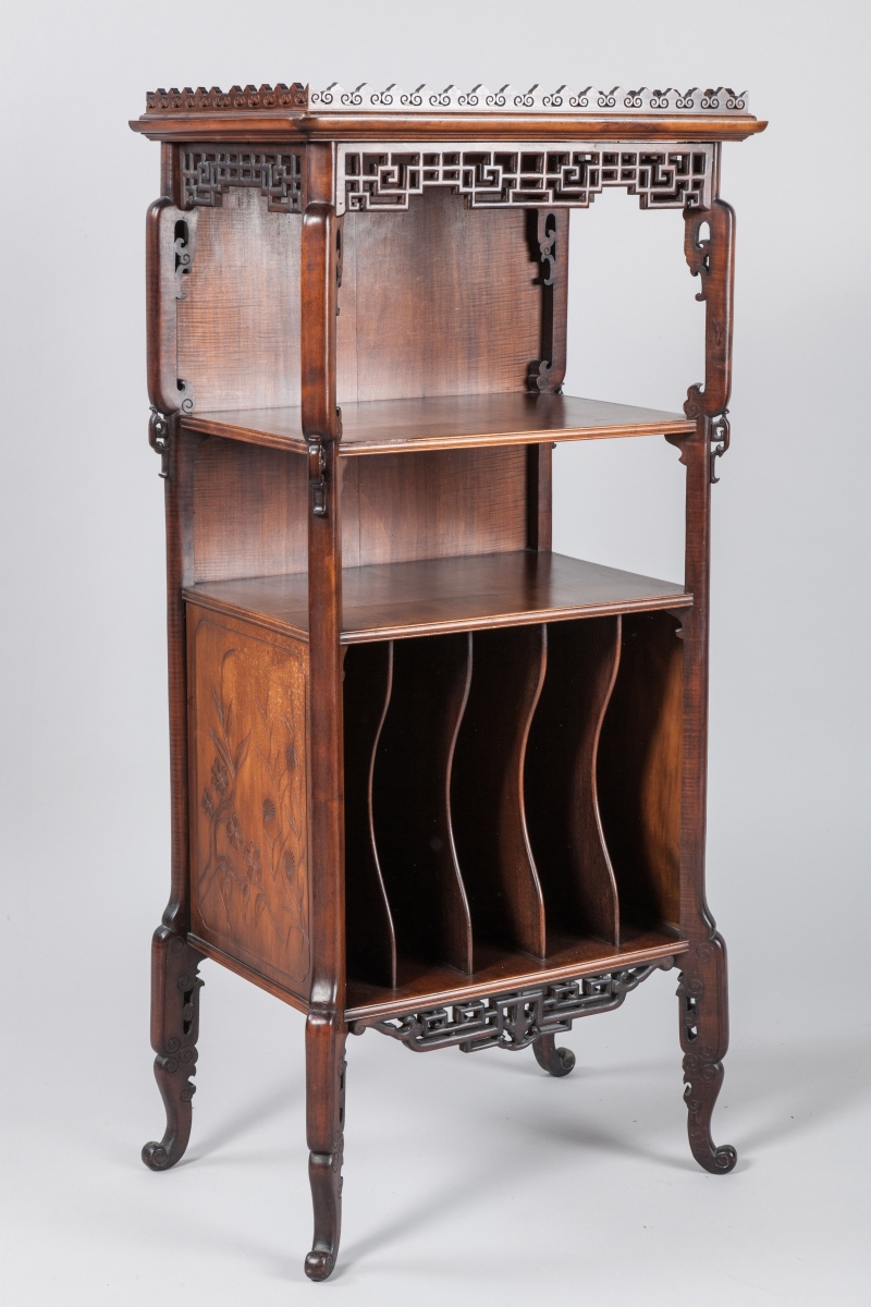 CLASSEUR À MUSIQUE en bois exotique sculpté et gravé. Plateau supérieur agrémenté d'une galerie sculptée d'une frise fleurie. Deux montants à décor ajouré et sculpté de rinceaux soutiennent un plateau intermédiaire. La partie inférieure ouvre à cinq compartiments verticaux. La traverse supérieure et le tablier à décor ajouré de filets à la grecque. Les panneaux latéraux sont ornés de fleurs gravées. Quatre pieds ajourés à enroulements.