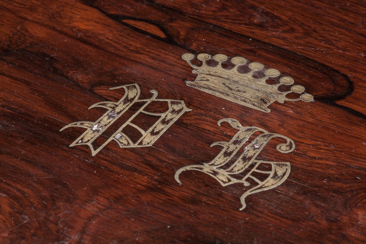 Coffret de forme rectangulaire en placage de palissandre à garnitures de laiton, bordées de filets ornés de palmettes en écoinçons - et centré du monogramme "PH" timbré d'une couronne comtale. Gravé " Aucoc aîné à Paris " sur la feuillure.
