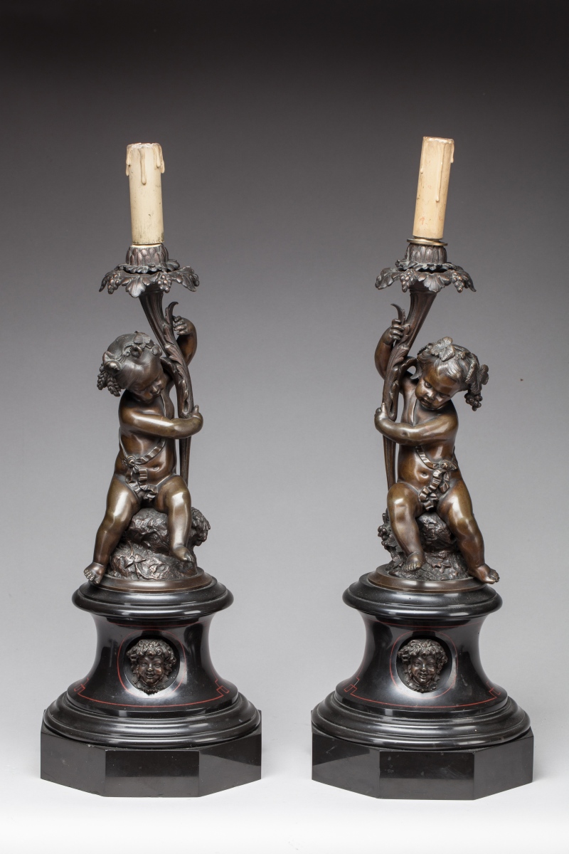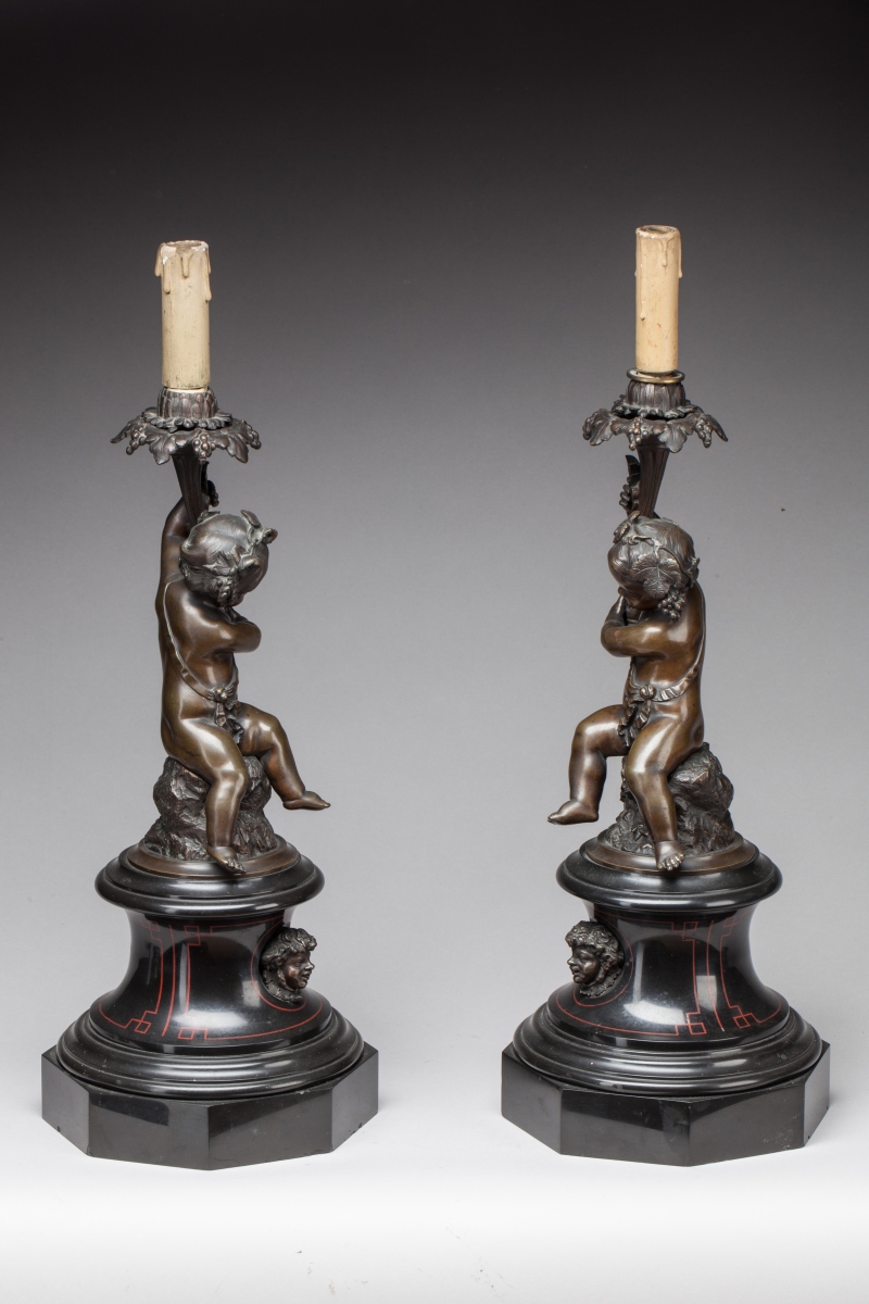 Paire de FLAMBEAUX l'ÉTÉ et l'AUTOMNE en bronze patiné figurant deux putti soutenant un bras de lumière chantourné à décor de cannelures, acanthes, feuilles de vigne et grappes de raisins. L'un, couronné de pampres de vigne, représente l'automne, l'autre coiffé de fleurs et gerbes de blé, l'été. Le binet adopte la forme d'une fleur de chrysanthème. Le piédouche en marbre noir à décor de filets en scagliole rouge est agrémenté d'un mascaron en bronze. Base octogonale.