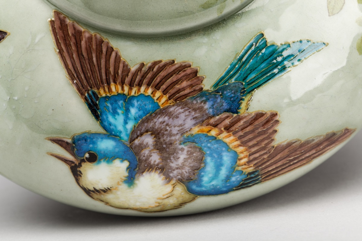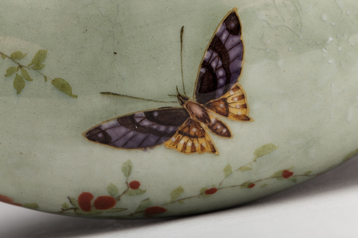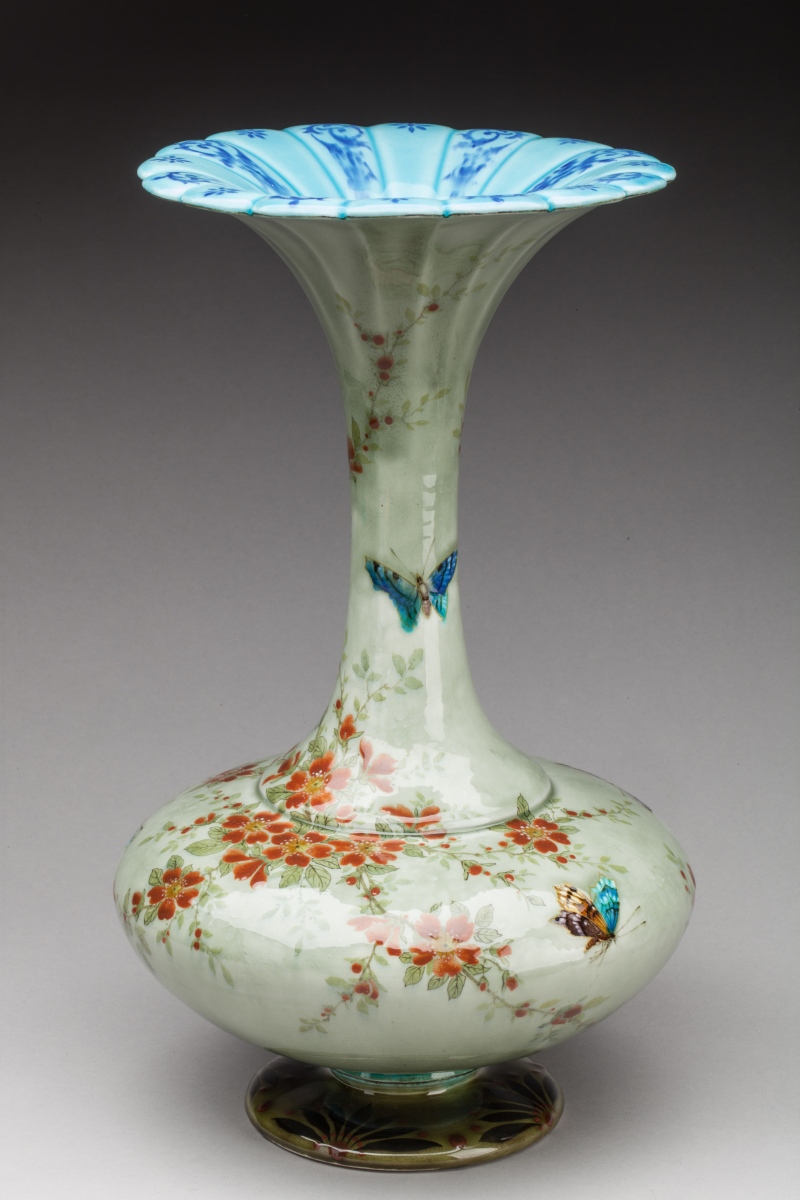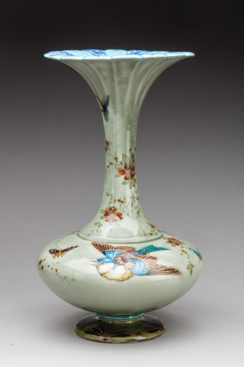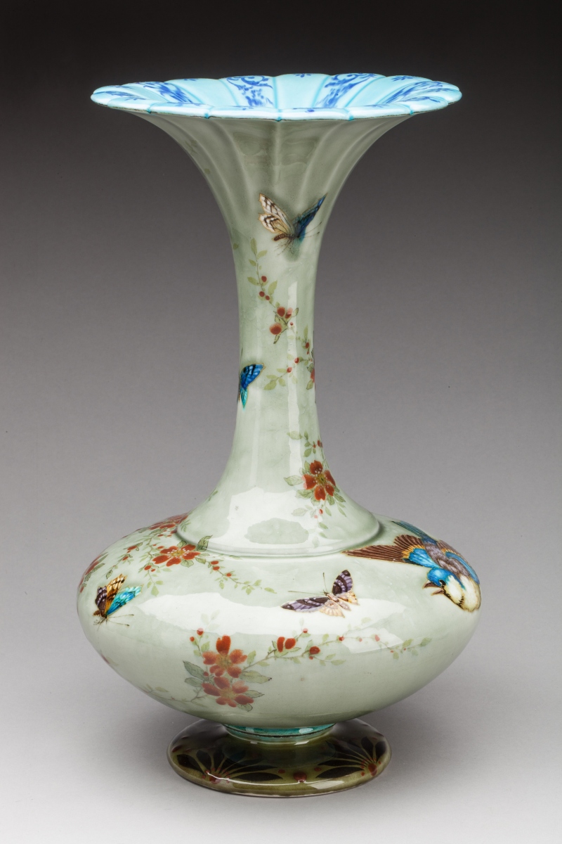 VASE en céramique émaillée à fond céladon à la mésange et aux papillons dans des branches de cerisier. Long col ouvert en corolle, large panse et piédouche.