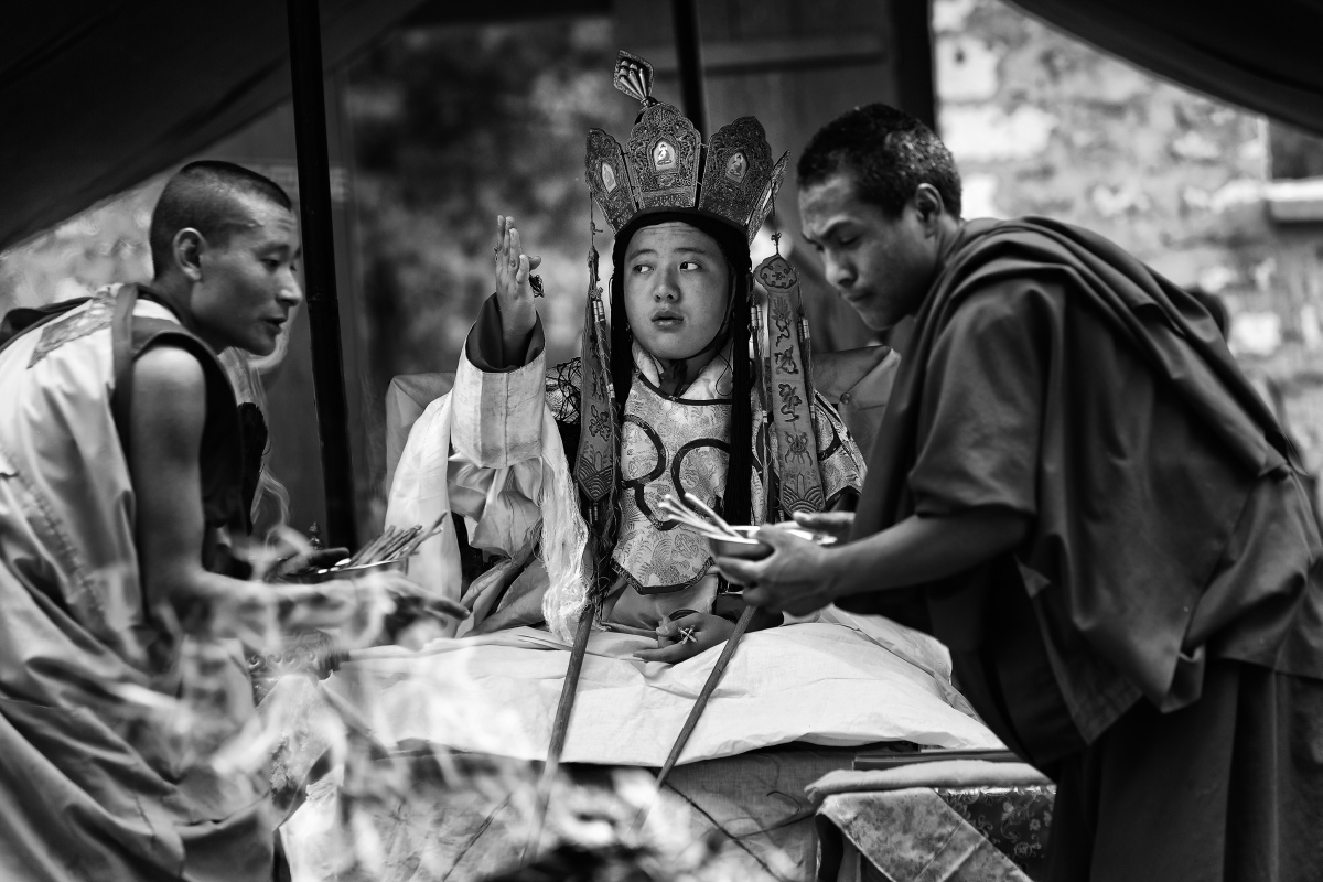 Le jeune Orguièn Tendzin Jigmé Lhundroup, ici âgé de 12 ans, qui fut reconnu comme l'incarnation de Dilgo Khyentsé Rinpotché, effectue une cérémonie d'offrande au feu, à Paro, au Bouthan, 2006.