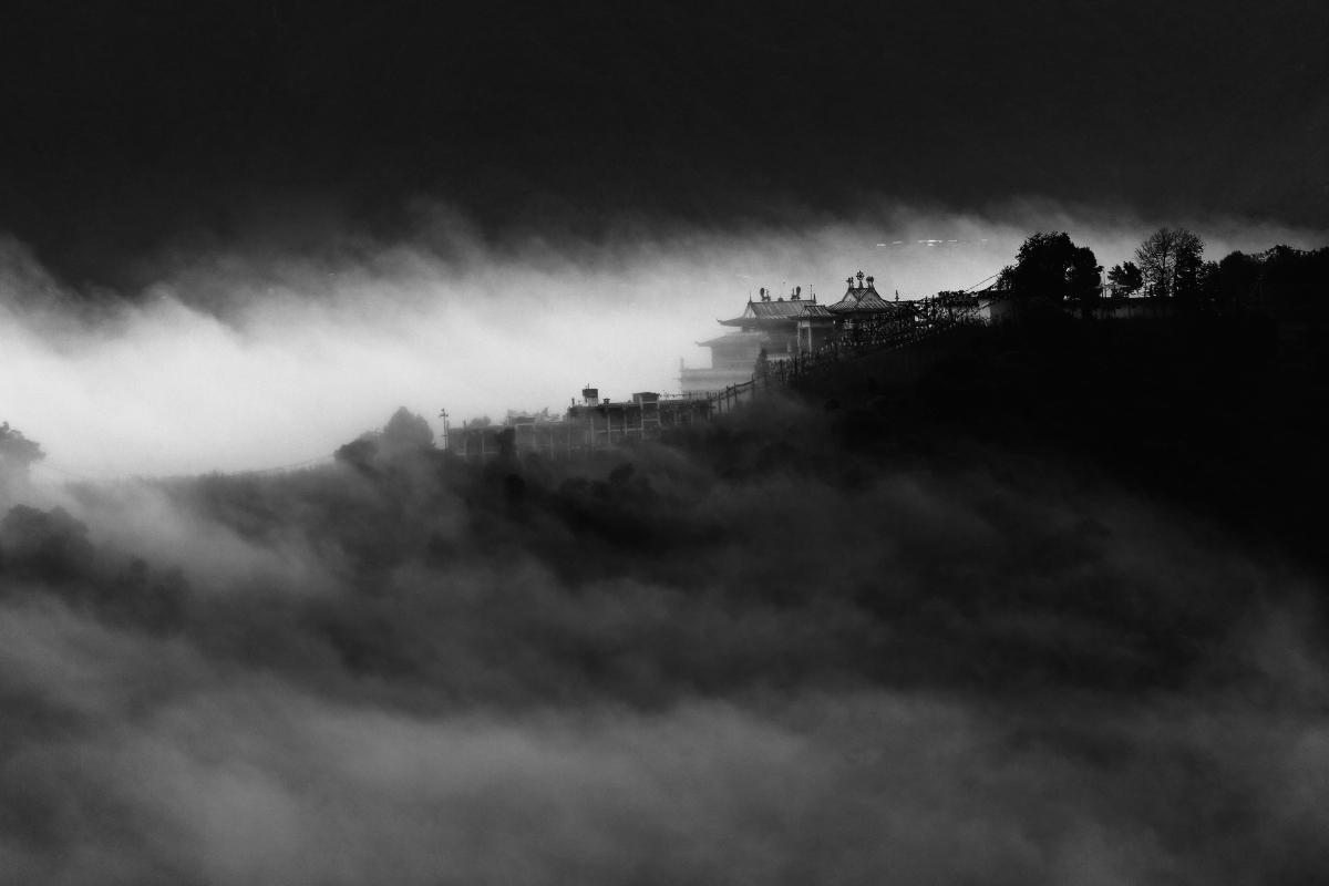Un monastère tibétain émerge des brumes matinales, au sommet de la colline de Namo Bouddha, Népal, septembre 2006.