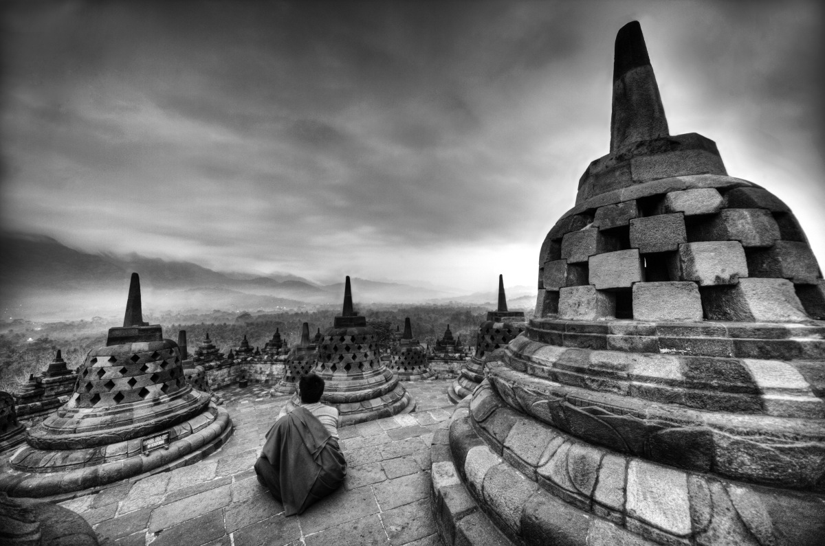 Le stoupa de Borobudur, à Java, en Indonésie, est le plus grand monument bouddhiste au monde. Il fut construit au IXème siècle durant la dynastie Sailendra. Abandonné au XIIème siècle au milieu de la jungle, il fut redécouvert en 1815 par Thomas Stamford Raffles, vice-gouverneur de Java. Construit selon la tradition du bouddhisme Mahayana, il comporte dix étages symbolisant les dix "terres" ou niveaux qui mènent graduellement à l'état de parfait Bouddha. Il contient plus de cinq cent statues du Bouddha de taille humaine et soixante douze stoupas plus petits. Le site de Borobudur fait partie de l'héritage mondial de l'Unesco depuis 1973. Juin 2008.