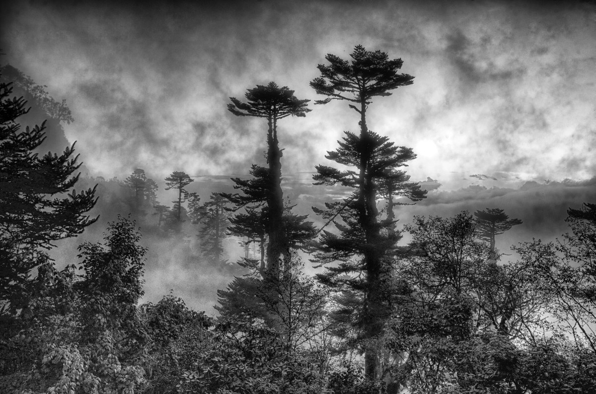A proximité du col de Pélé-la (3300m d'altitude), ces conifères majestueux et plusieurs fois centenaires ornent les hauteurs des "montagnes noires", qui séparent le Bhoutan occidental du Bhoutan central, 2011.