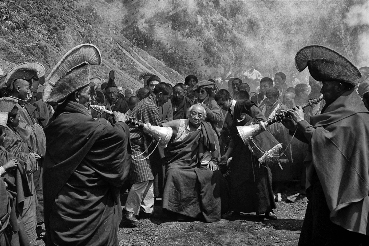 En 1985, après trente ans d'exil en Inde, Dilgo Khyentsé Rinpotché est accueilli par deux moines musiciens, joueurs de gyaliing, lors de son retour dans les ruines du monastère de Shéchèn, qui fut rasé lors de la Révolution culturelle chinoise, 1985.
