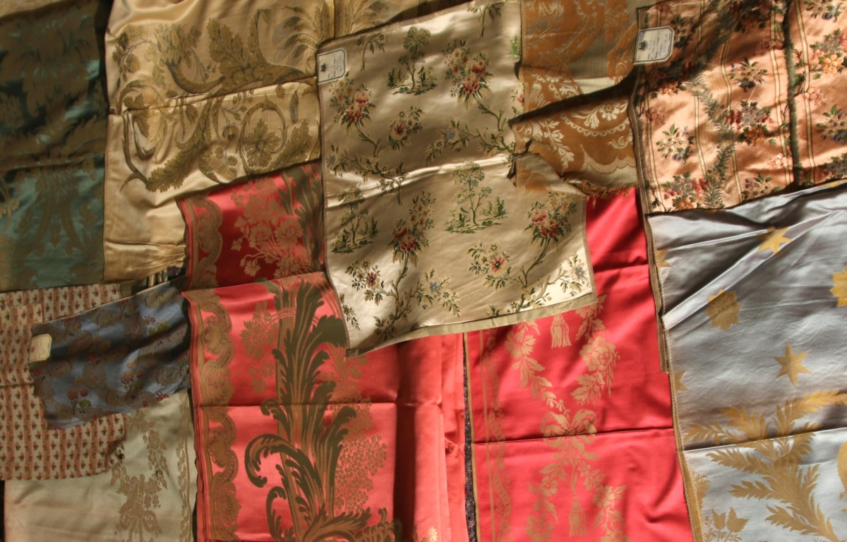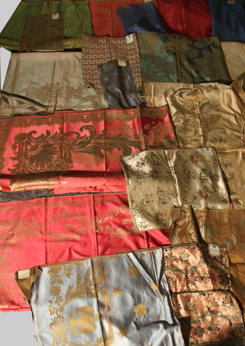 Réunion de DAMAS, LAMPAS, style du XVIIIème siècle et Empire, bleu, vert, jaune, rouge et crème, bords de rideaux tissés à la forme.