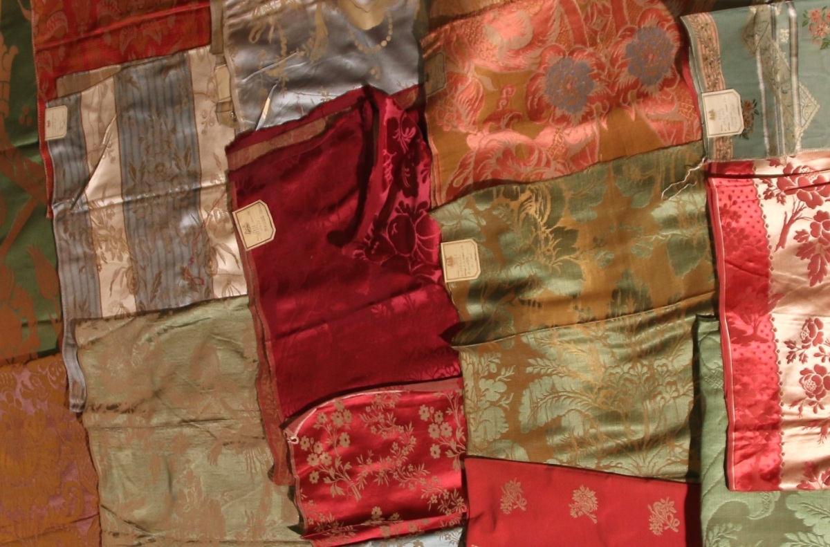 Réunion de BROCATELLES, DAMAS, LAMPAS, moire, style du XVIIIème siècle, vert, jaune, rouge et crème. Lampas d'après un dessin ottoman.