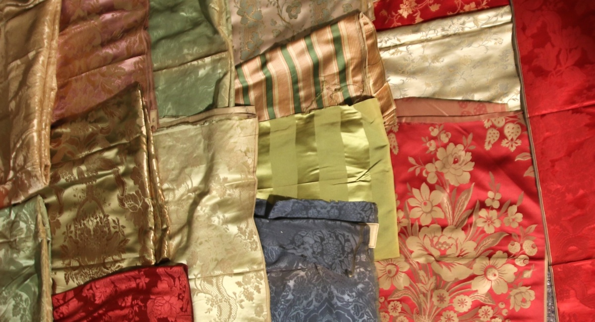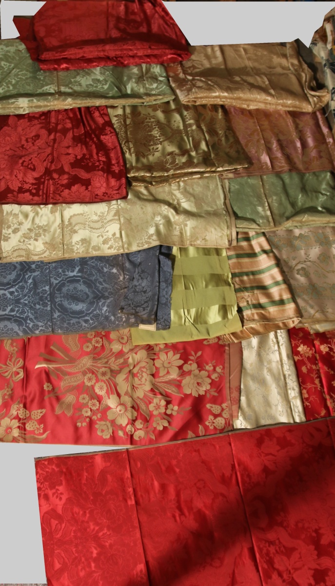 Réunion de DAMAS, LAMPAS, imberline, style du XVIIIème siècle, vert, rouge et crème, fleurs, dentelle.