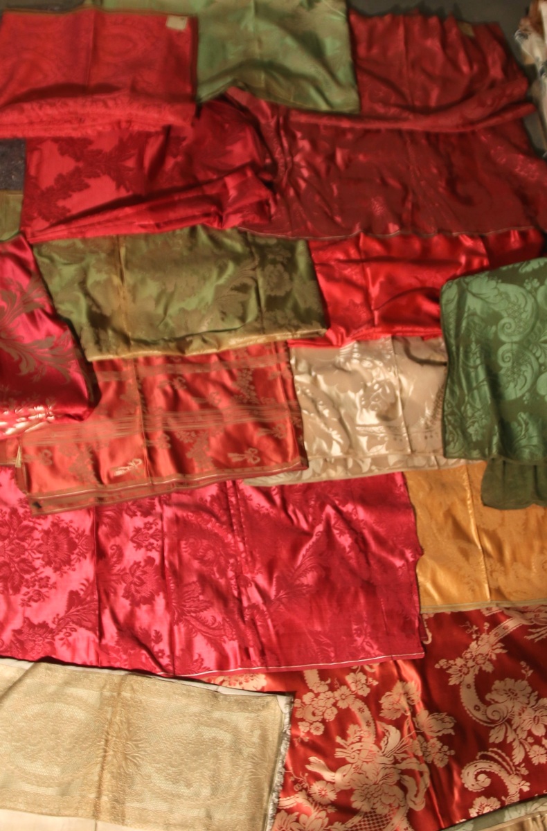 Réunion de DAMAS, LAMPAS, style Empire et du XVIIIème siècle, vert, rouge et crème.