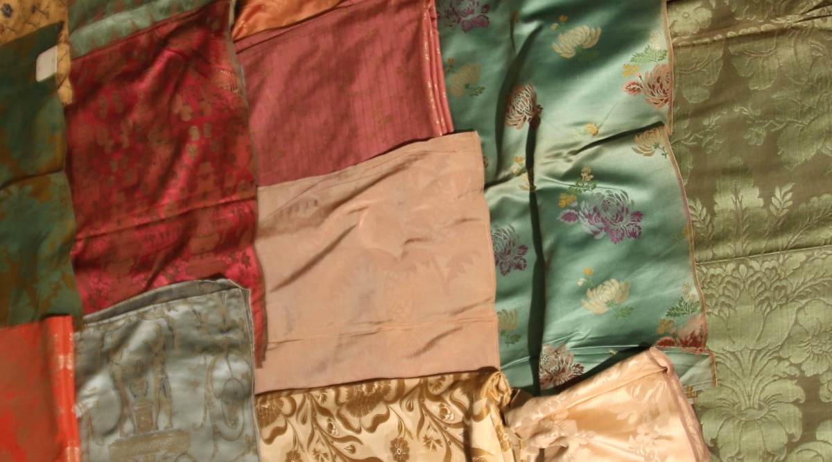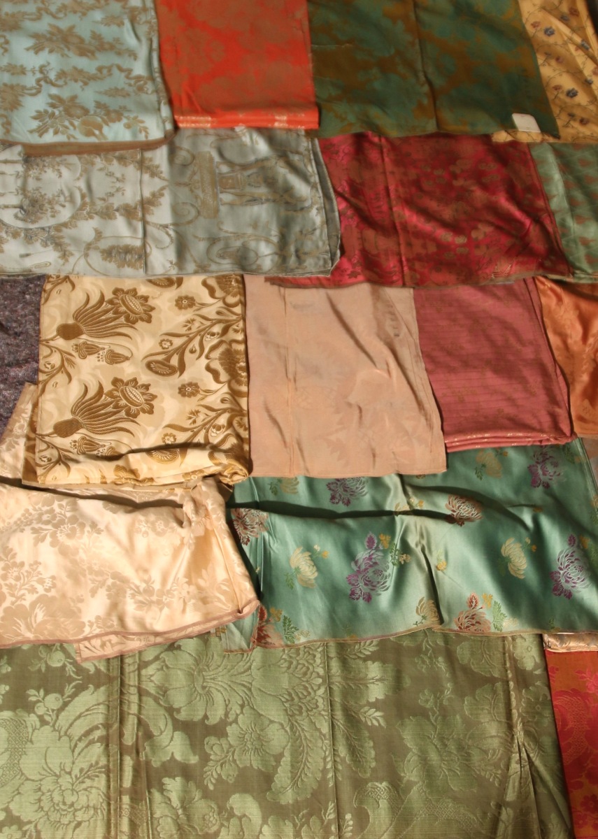 Réunion de DAMAS, LAMPAS, style du XVIIIème siècle, bleu, vert, rouge et crème.