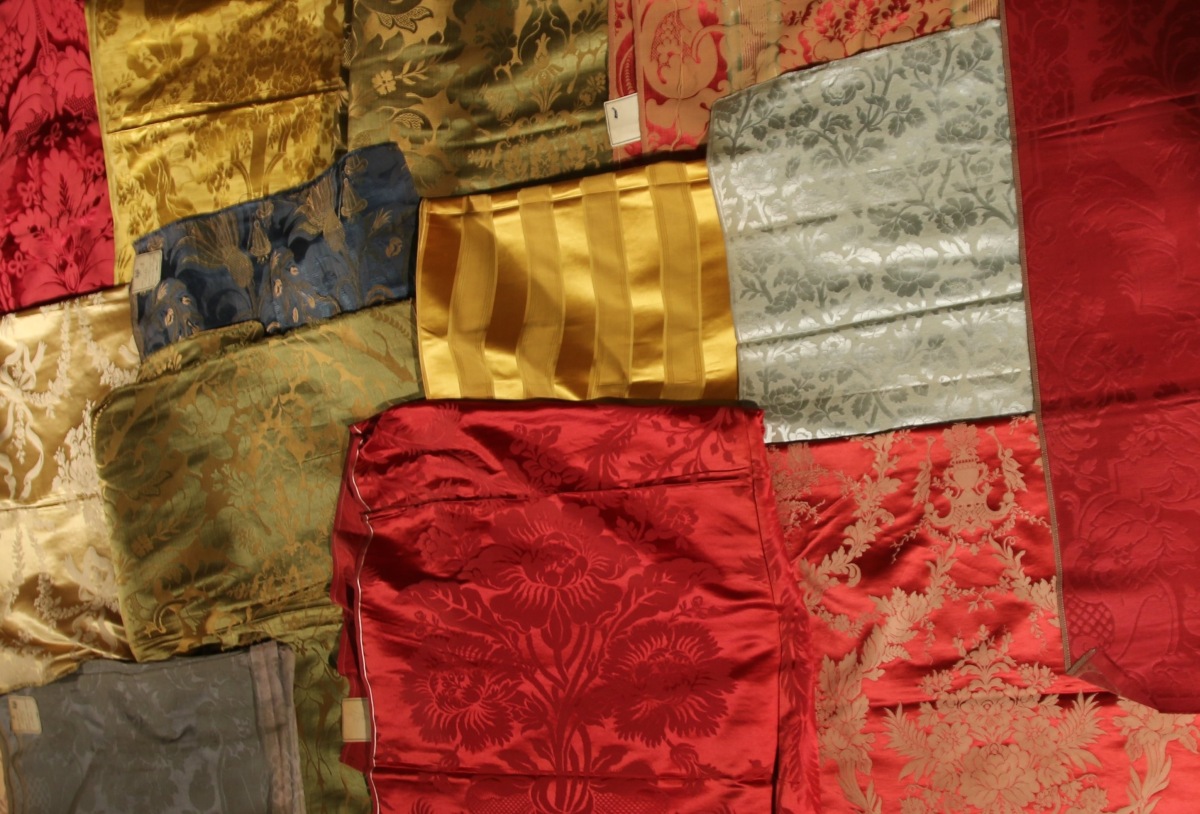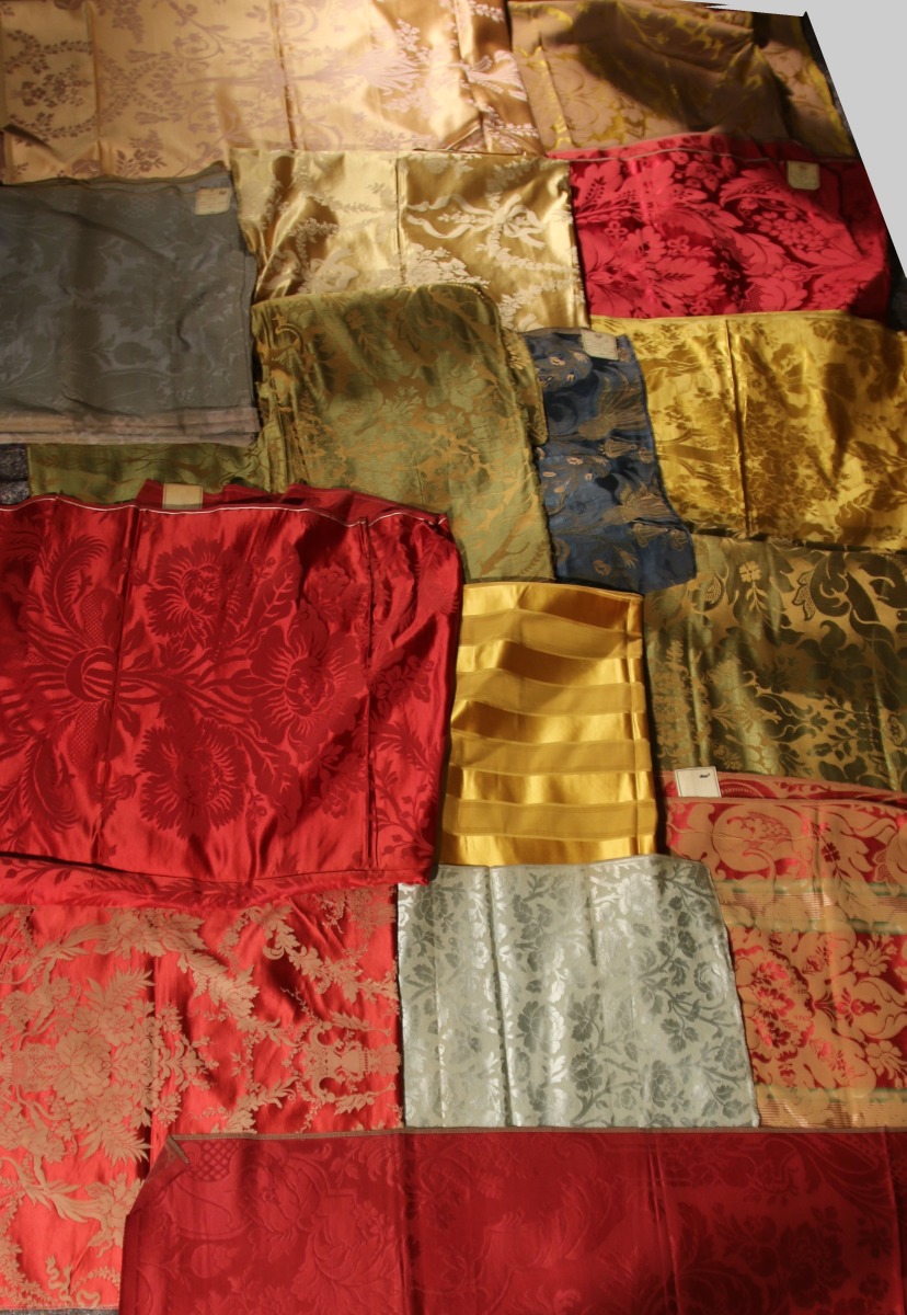 Réunion de DAMAS, BROCATELLE, satin rayé, lampas, style Renaissance et du XVIIIème siècle, bleu, vert, rouge et crème.