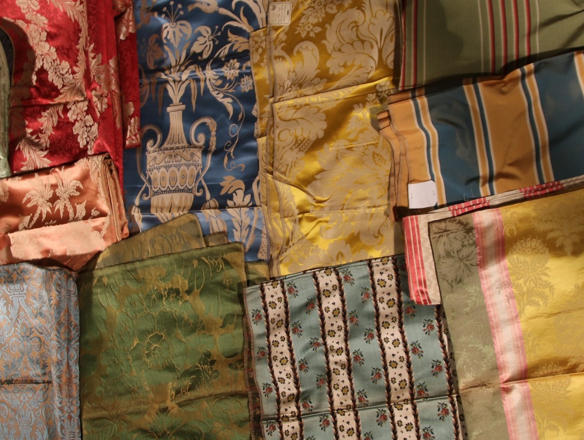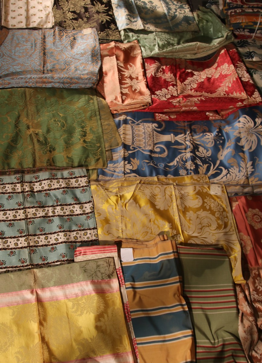 Réunion de DAMAS, LAMPAS, style Empire et du XVIIIème siècle, bleu, jaune, vert, rouge et crème.