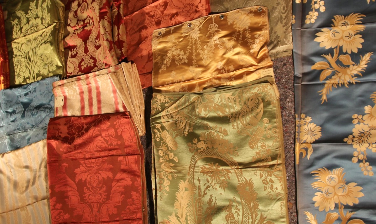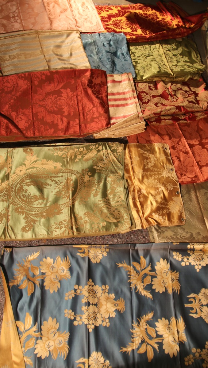 Réunion de DAMAS, LAMPAS, style du XVIIIème siècle, bleu, vert, rouge et crème.