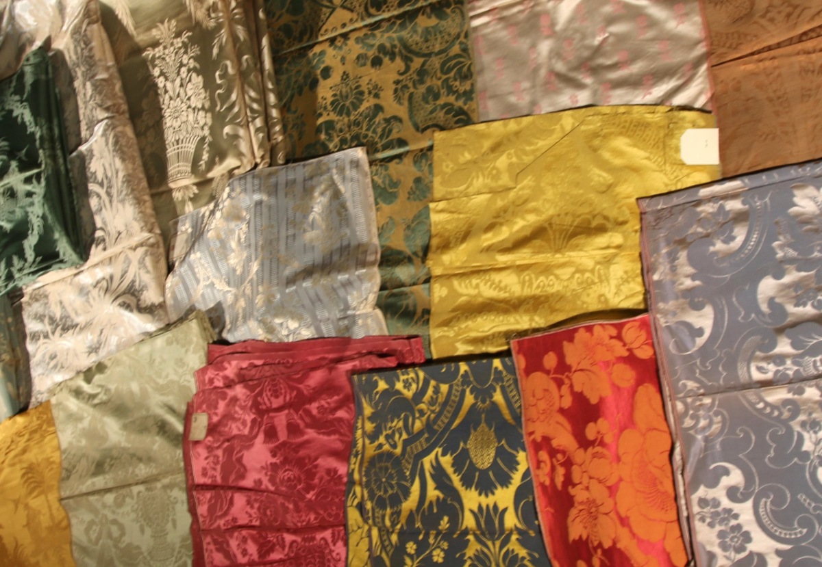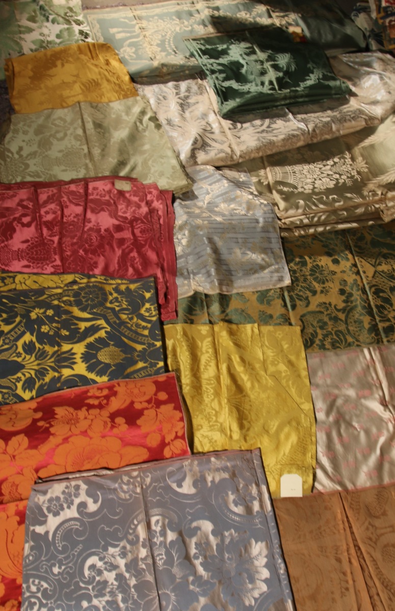 Réunion de DAMAS, LAMPAS, brocatelle, style du XVIIIème siècle, jaune, bleu, vert, rouge et crème, chinois, fleurs.