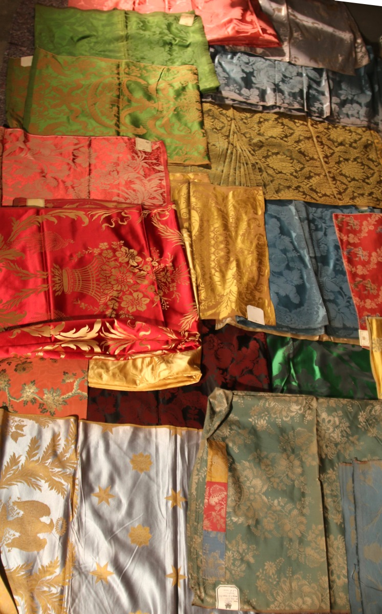Réunion de BROCATELLE, DAMAS, LAMPAS, style Empire et du XVIIIème siècle, bleu, vert, rouge et crème.