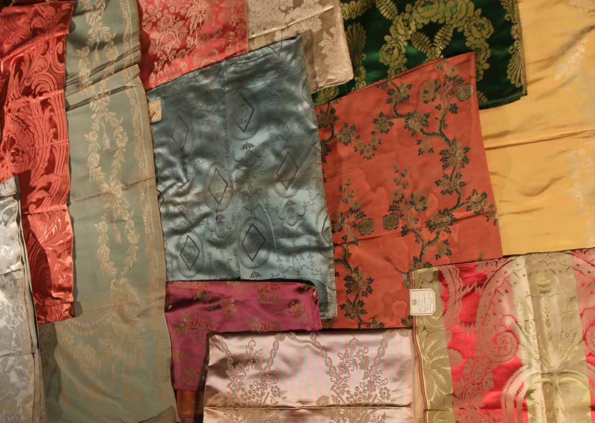 Réunion de DAMAS, LAMPAS, style du XVIIIème siècle, bleu, vert, rouge et crème.