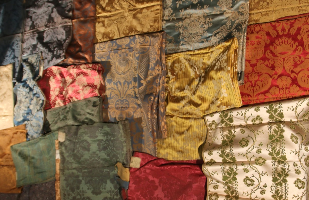 Réunion de BROCATELLE, DAMAS, LAMPAS, style Renaissance et du XVIIIème siècle, jaune, bleu, vert, rouge et crème.