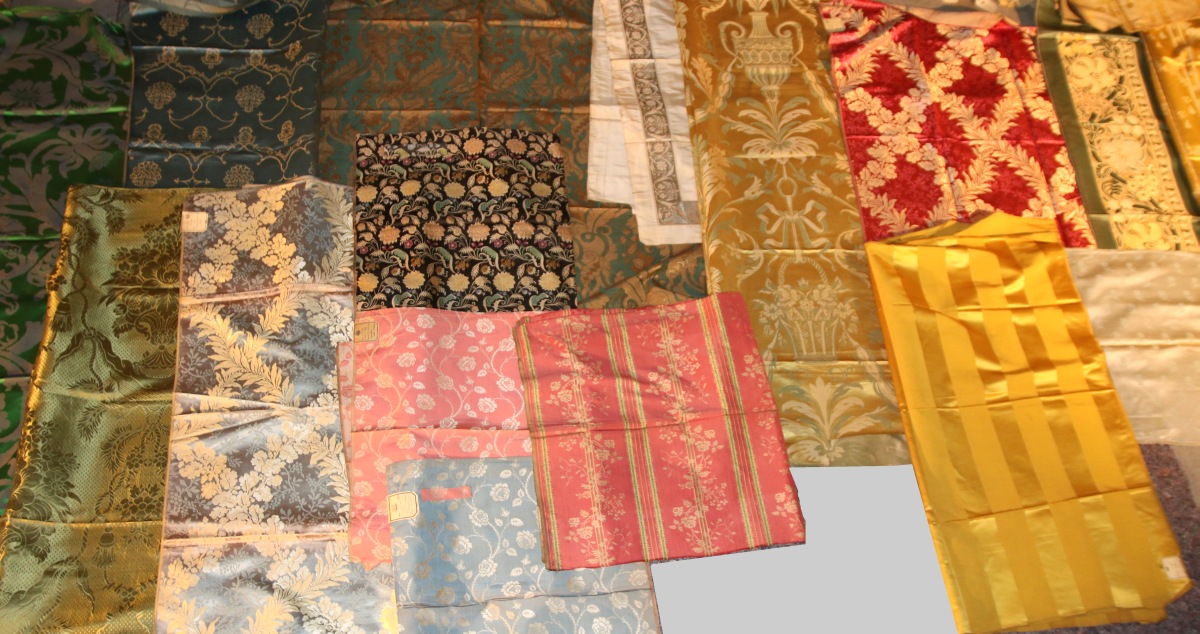 Réunion de DAMAS, LAMPAS, BROCATELLE, style Renaissance et du XVIIIème siècle, jaune, bleu, vert, rouge et crème, fleurs.