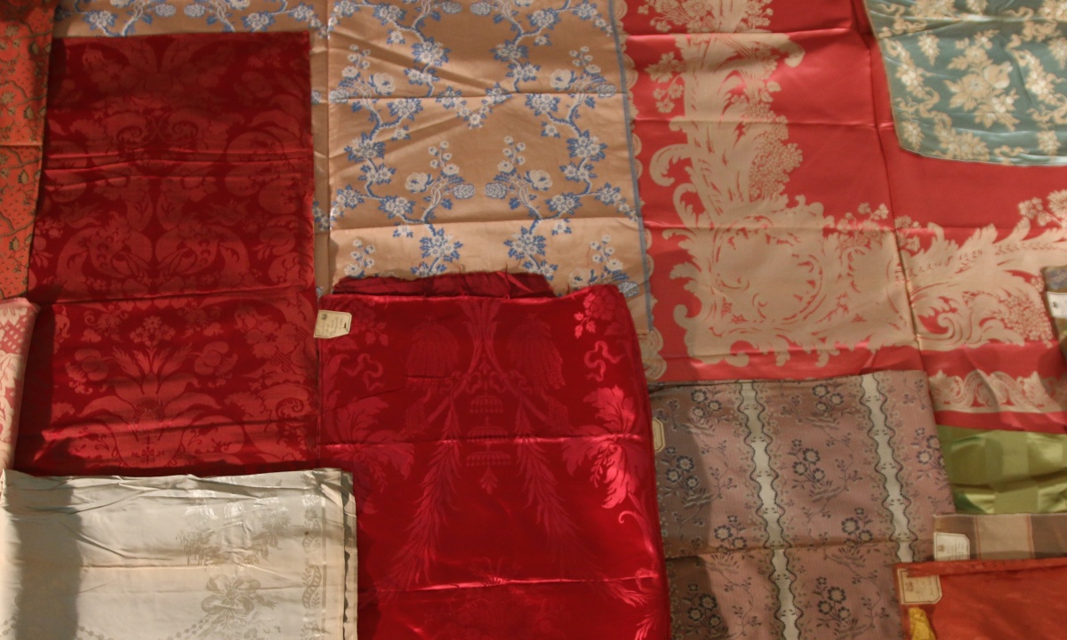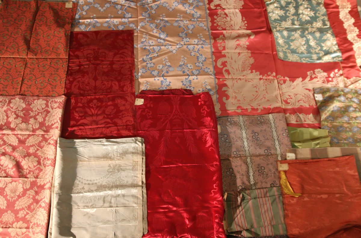 Réunion de DAMAS, LAMPAS, BROCATELLE, style du XVIIIème siècle, rose, bleu, vert, rouge et crème, fleurs, rayures.