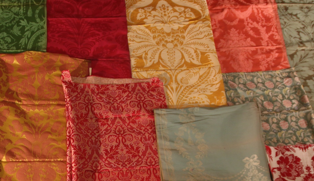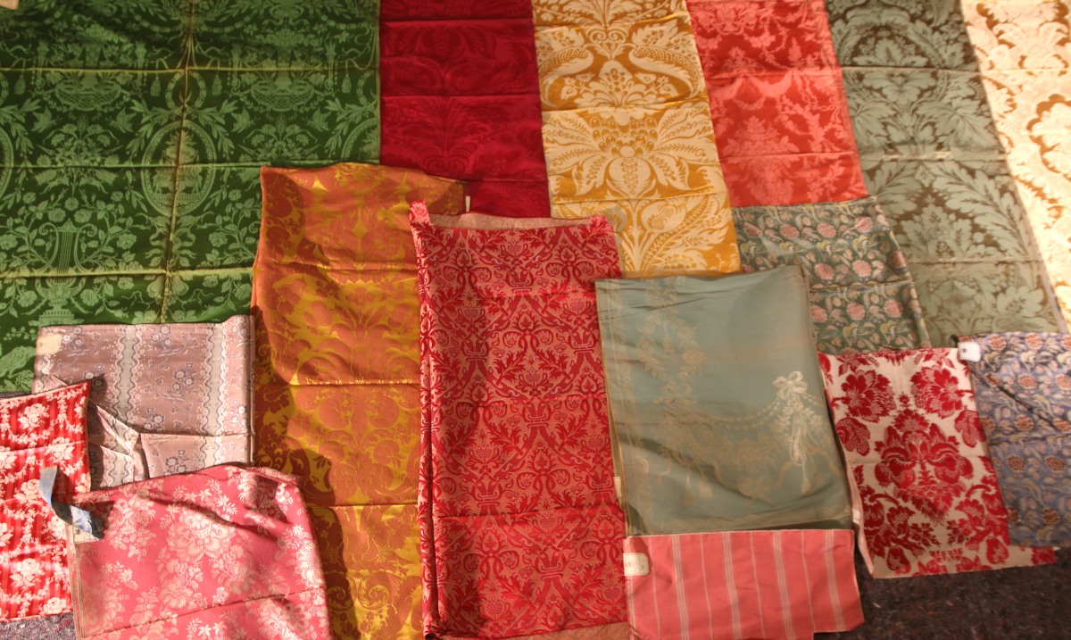 Réunion de DAMAS, LAMPAS, BROCATELLE, style Renaissance et du XVIIIème siècle, jaune, bleu, vert, rouge et crème.