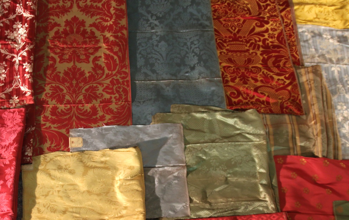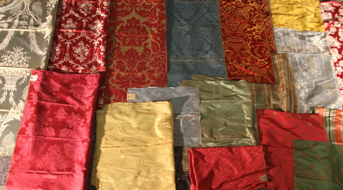Réunion de DAMAS, LAMPAS, BROCATELLE, style Empire, Renaissance et du XVIIIème siècle, jaune, bleu, vert, rouge et crème.