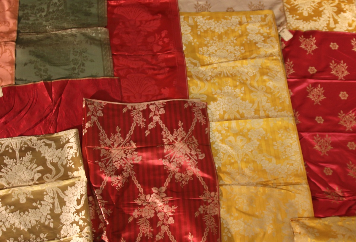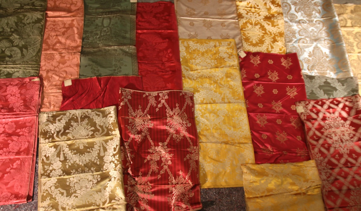 Réunion de DAMAS, LAMPAS, BROCATELLE, style Renaissance, Empire et du XVIIIème siècle, jaune, bleu, vert, rouge et crème, trophées de jardinage, fleurs.