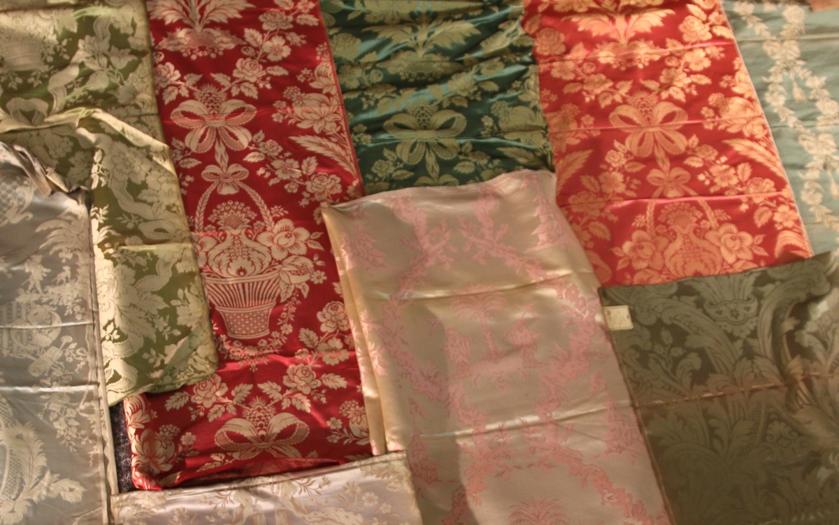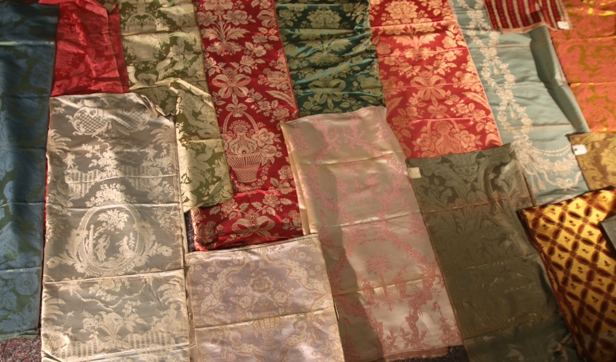 Réunion de DAMAS, LAMPAS, BROCATELLE, style du XVIIIème siècle, jaune, bleu, vert, rouge et crème, chinois.