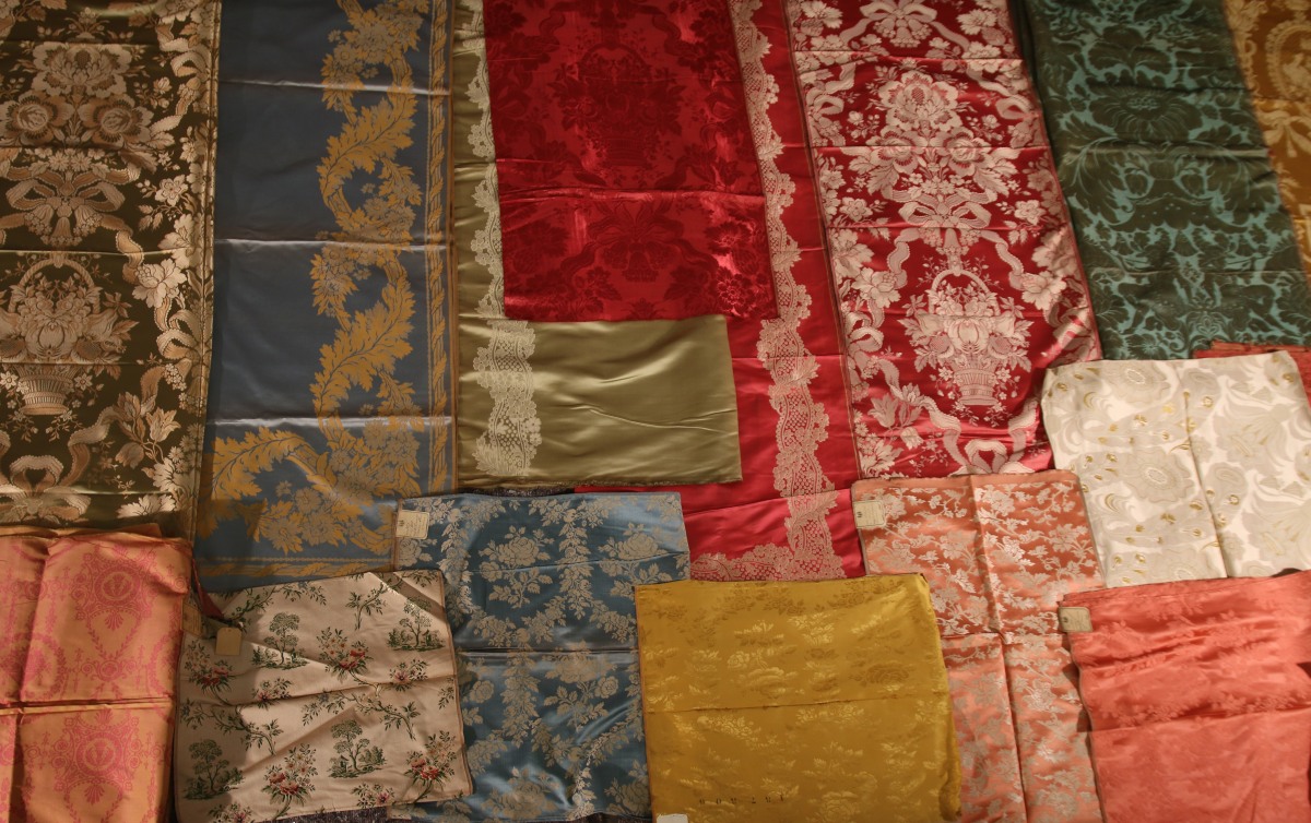 Réunion de DAMAS, LAMPAS, BROCATELLE, style du XVIIIème siècle, rose, jaune, bleu, vert, rouge, chinois.